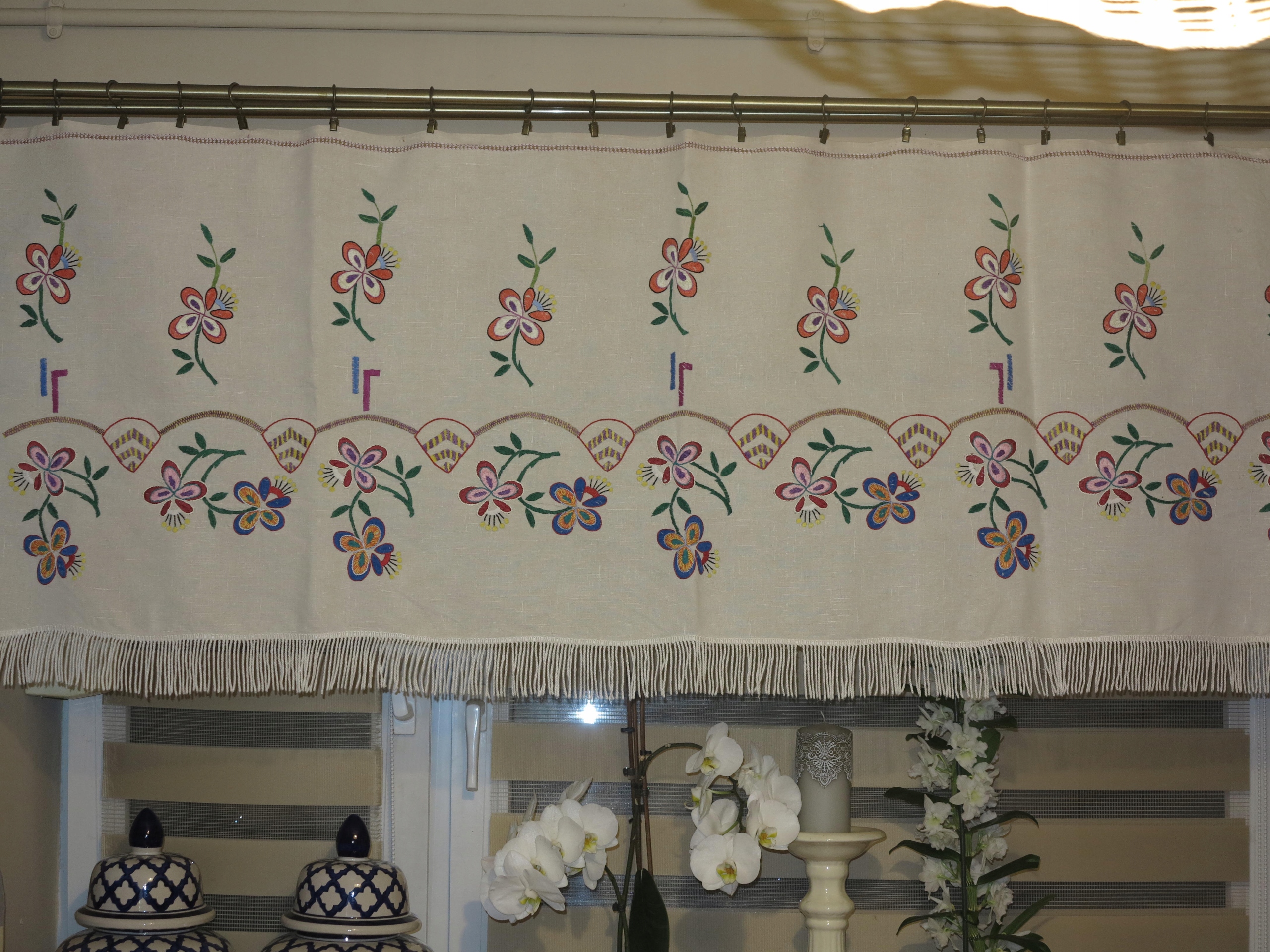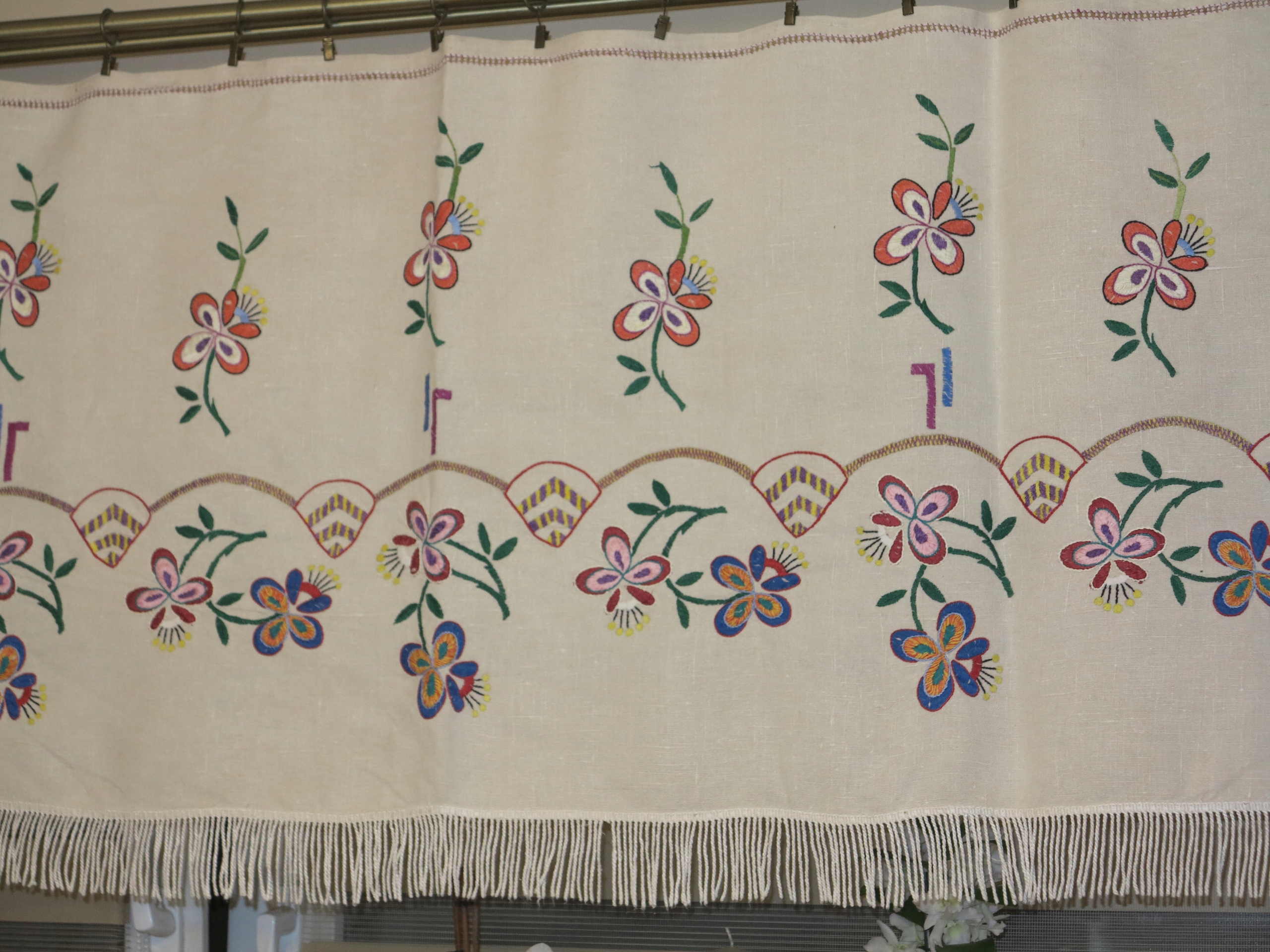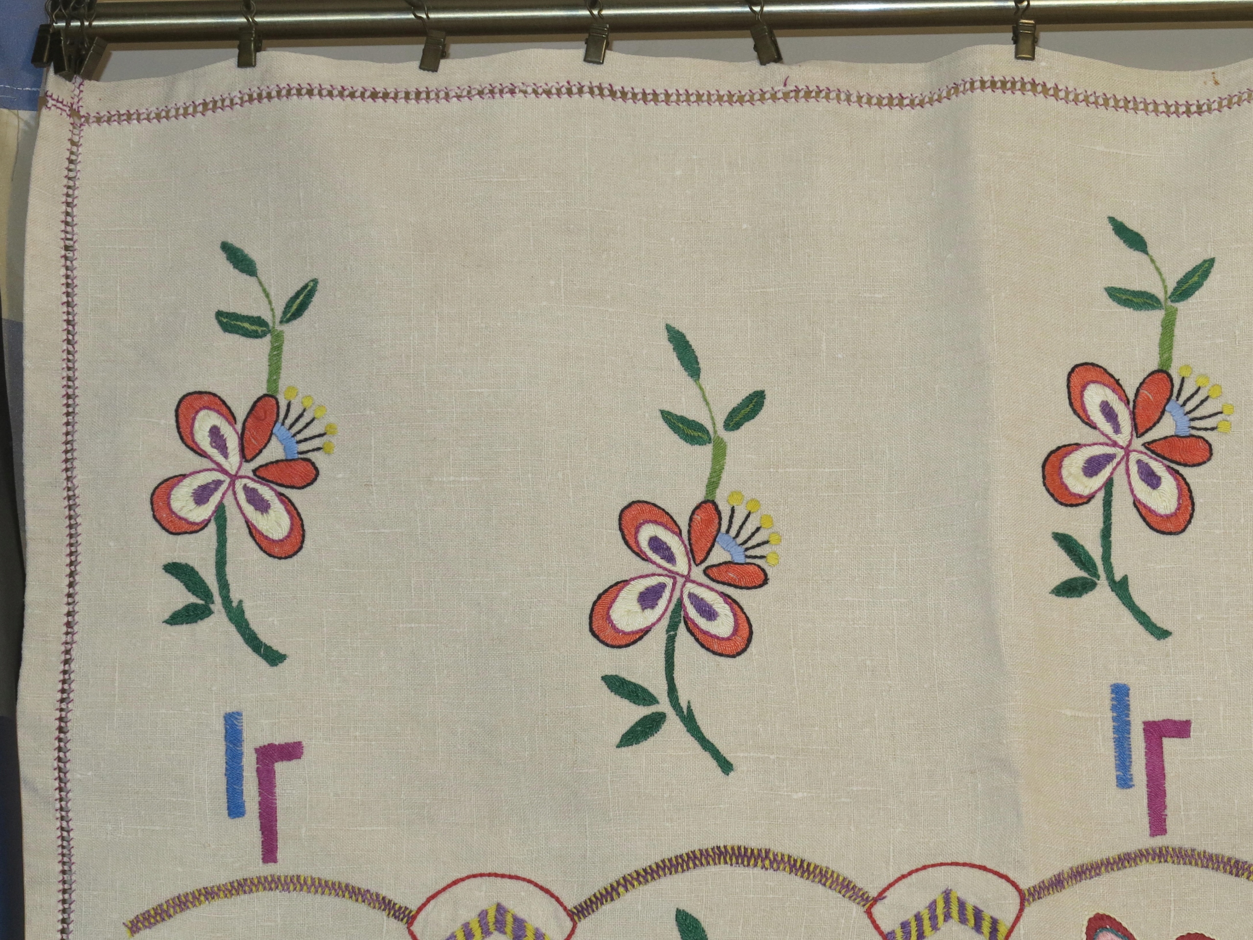 КРАСИВЫЙ, ВЕКОВОЙ ЛЬНЯНОЙ НАСТЕННЫЙ КИЛИМ С НАРОДНОЙ ВЫШИВКОЙ РУЧНОЙ РАБОТЫ. НИЗ ОТДЕЛЕН БАХИРОЙ. УКРАШЕН ВЕРХНЕЙ И БОКОВЫМИ БРИФИНАМИ РУЧНОЙ РАБОТЫ.