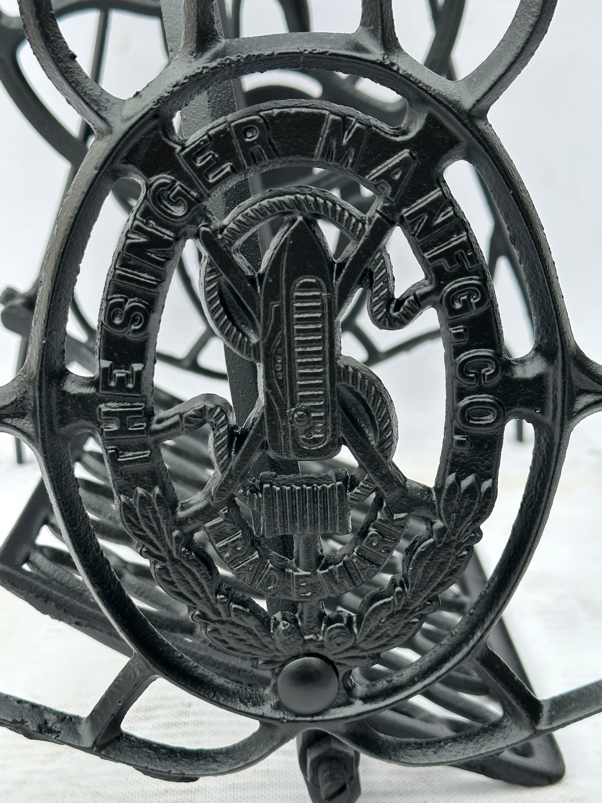 Предмет продажи — старая чугунная основа от швейной машины SINGER. Очень красивый узор. Надписи THE SINGER MANFG по бокам. ЧТО. ТОВАРНЫЙ ЗНАК. Колеса внизу сняты, что делает стол более устойчивым и не будет двигаться.Дополнительным преимуществом является металлический элемент, соединяющий колесо с педалью привода, поэтому мы можем быть уверены, что он не сдвинется с места, его съедят лесоеды, что возможно в основаниях с деревянным элементом.