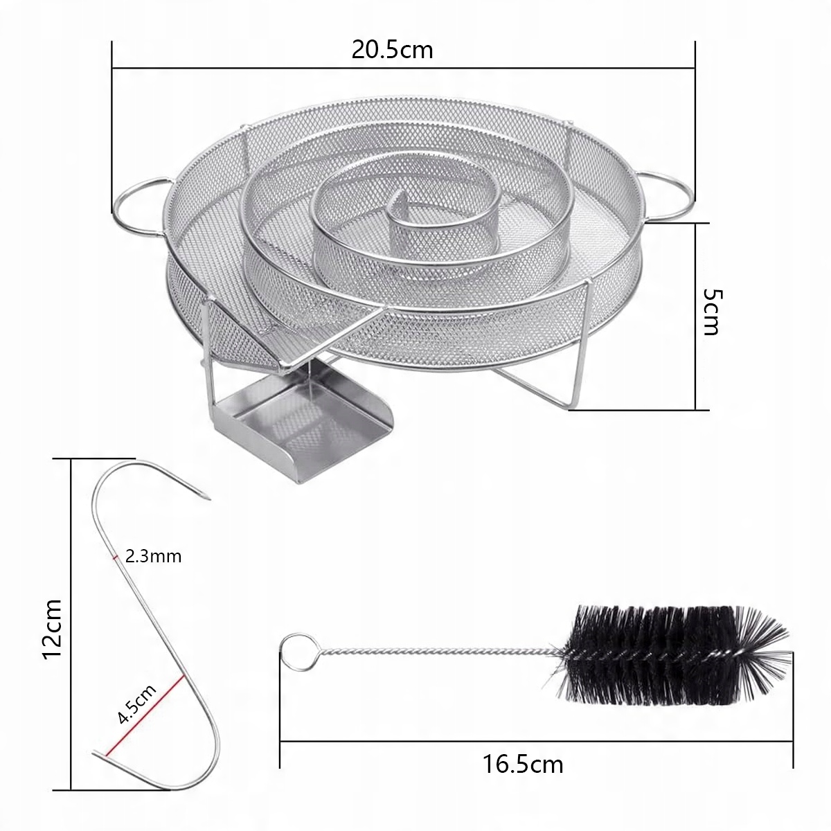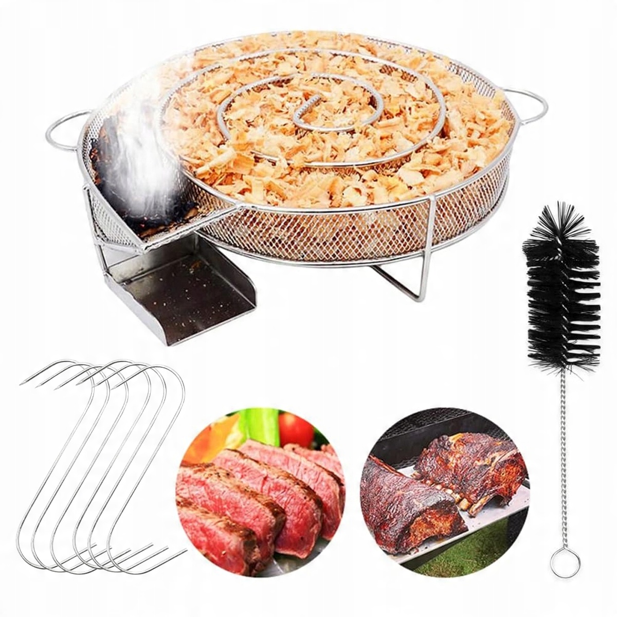 ➡ Спираль с круглой дымкой изготовлен из прочного, высокого качества 304 нержавеющей стали и идеально подходит для более короткого времени приготовления (7-10 часов холодного курения). Прикрепленная чистящая щетка облегчает очистку дыры из нержавеющей стали. После сжигания просто встряхните пепел и удалите последние остатки, используя чистящую щетку. Набор также включает в себя 6 S -обработанных крючков для висящего мяса во время курения.