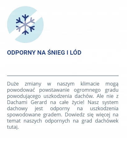 Вся металлочерепица (более известная как металлочерепица) от Gerard Roofing покрыта минеральным порошком, который создает шероховатую текстуру на поверхности крыши, предотвращая тем самым скатывание снега, опасного для жизни и здоровья. Это отличная альтернатива дорогим и неприглядным снежным барьерам, благодаря которым белое покрытие остается безвредным на крыше до тех пор, пока оно безопасно и естественным образом не растает. Решения серии Gerard® прошли испытания, в том числе, в сложных зимних погодных условиях Подхале и Закопане, поэтому листы с вулканическими посыпками наверняка подойдут и вам.