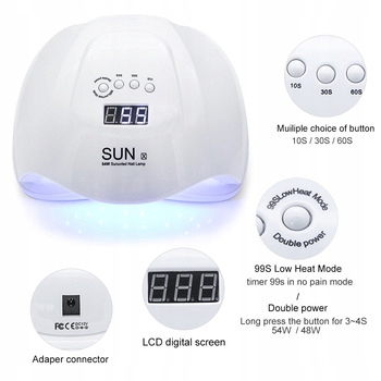 Умная система включает режим низкого нагрева 99 секунд — это режим, в котором мощность лампы постепенно и автоматически увеличивается с 24 до 54 Вт в течение 99 секунд. . Этот режим рекомендуется для работы со строительными гелями и другими материалами, требующими длительного отверждения. Лампа имеет таймер на 30, 60 и 99 секунд. Нижняя панель лампы съемная и ее можно легко снять для использования в педикюре.