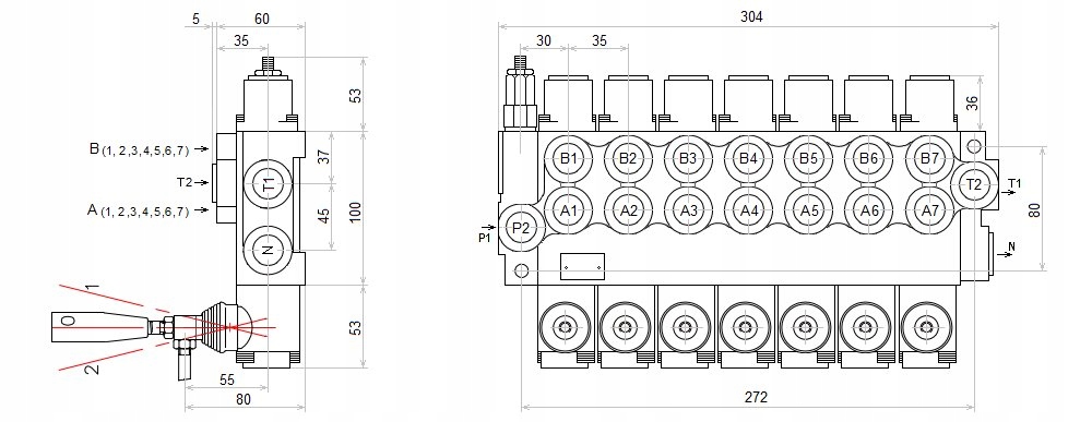 - Источник питания от насоса (P1, P2): BSP 1/2 '' Внутренняя нить B2, B3, B4, B5, B6, B7): BSP 3/8 '' Внутренняя нить: 50BAR . запуск.