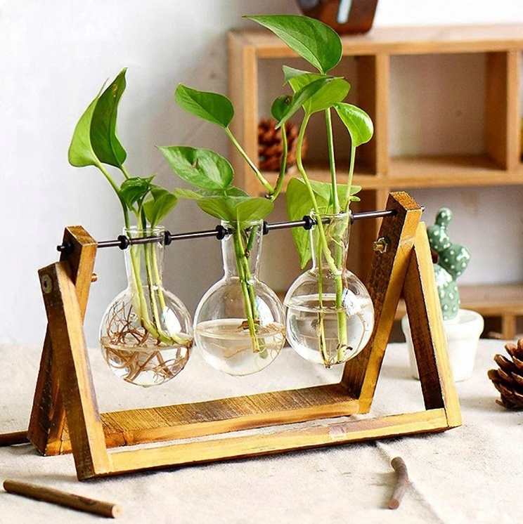 Гидропонная ваза с тремя стеклянными горшками. Идеально подходит для выращивания цветов и трав в домашних условиях. Гидропонный метод – это выращивание без почвы с использованием воды и растворов минеральных солей, что позволяет растениям расти без использования земли. Имеет эстетичную деревянную подставку. Он будет идеален в качестве украшения внутри помещений, демонстрируя всю корневую систему растений.
