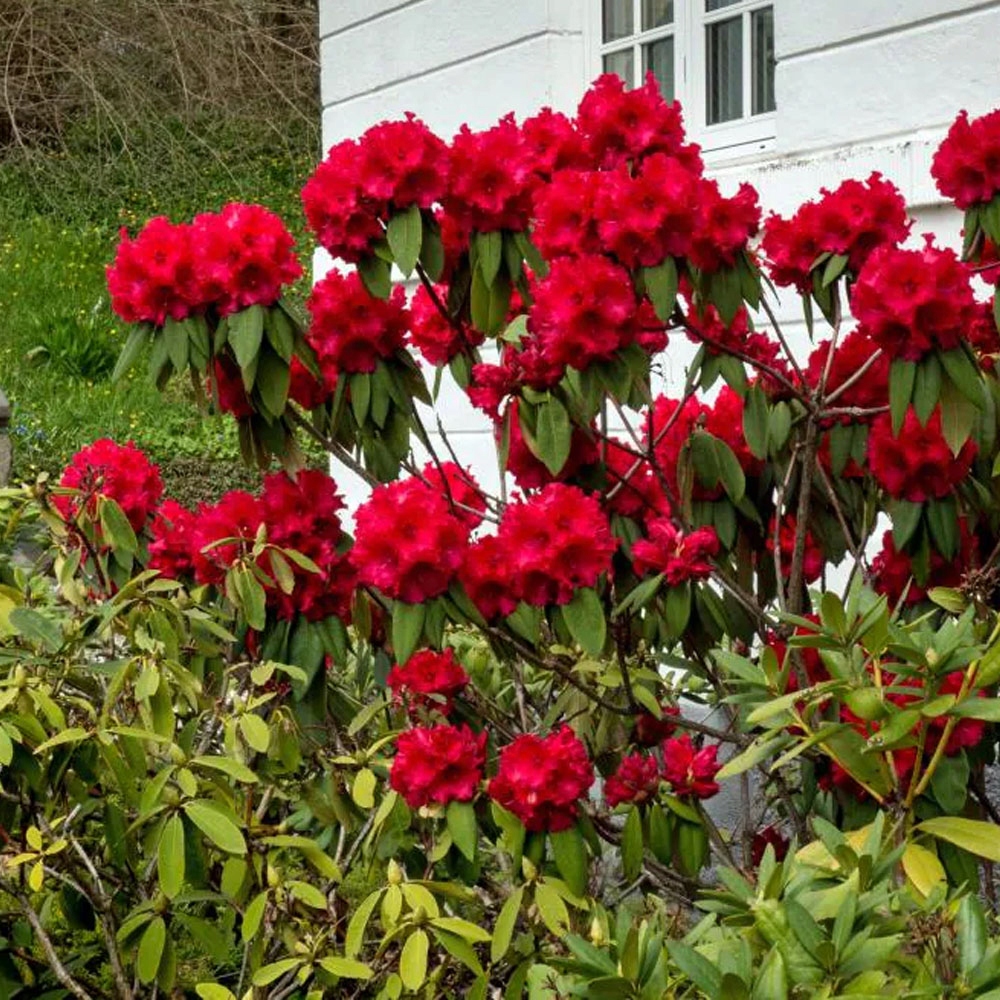rododendron (rododendron) - это распространенный вечнозеленый кустарник с возведенной привычкой. Этот сорт способен достичь размера 3 метра высотой и шириной 2,5 м в течение 10 лет. Большие цветы с очень красными, собранными в сферических и густых, вершиновых соцветиях. Это расцветает на рубеже мая и июня. Стоит добавить, что Rhododendron - это растение, которое требует кислой, проницаемой и умеренно влажной почвы. Это идеальное разнообразие для посадки в садах и в парках, с очень хорошей морозной сопротивлением.