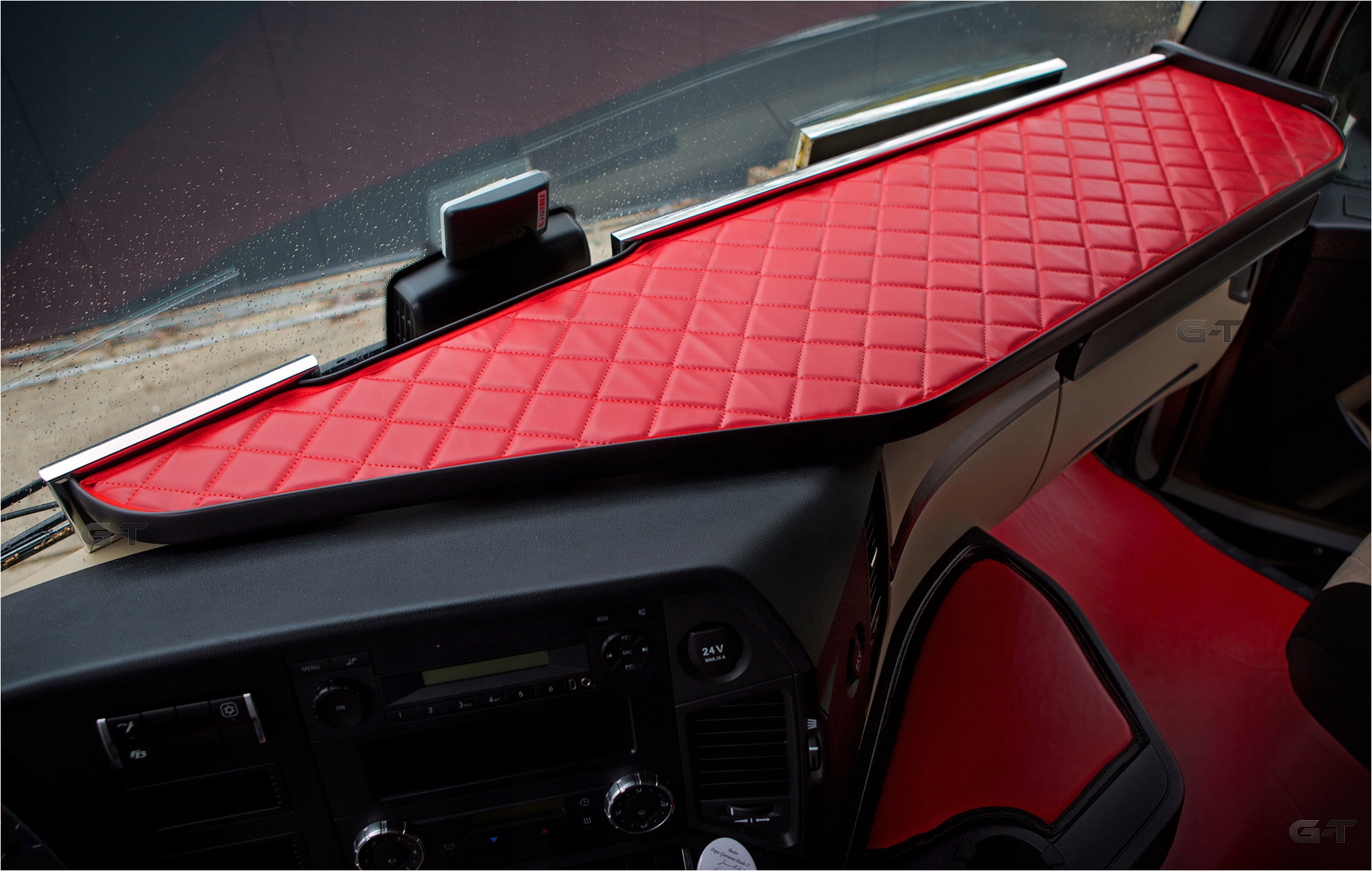 предмет аукциона - комплектный, большой стол с ящиком для Mercedes Actros MP IV 2011 года, в высокой (широкой) кабине, облицованный красным ковриком из эко-кожи. . h1>