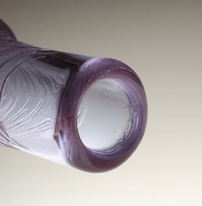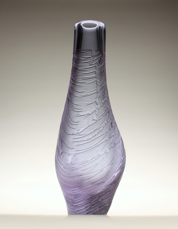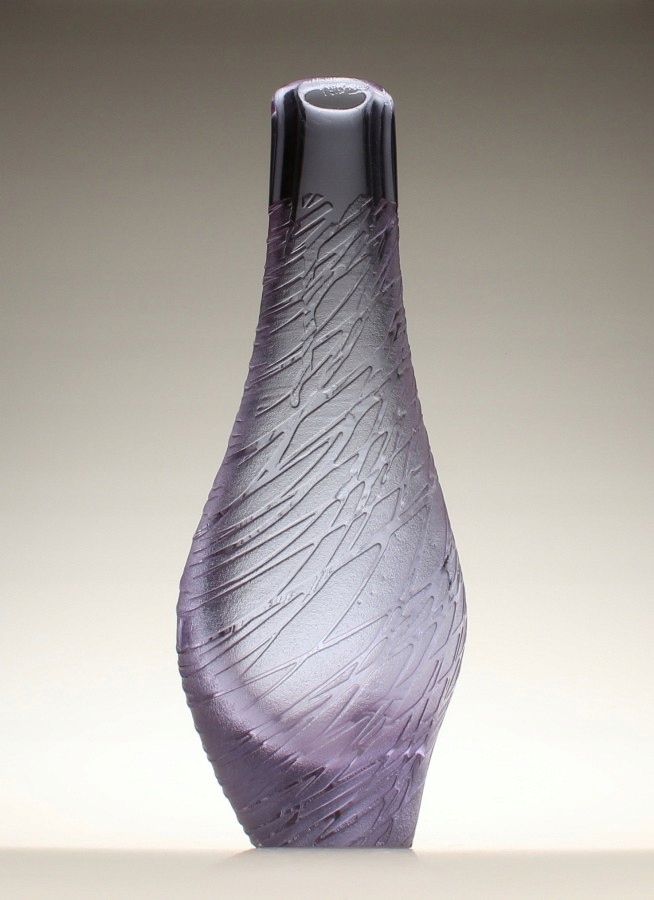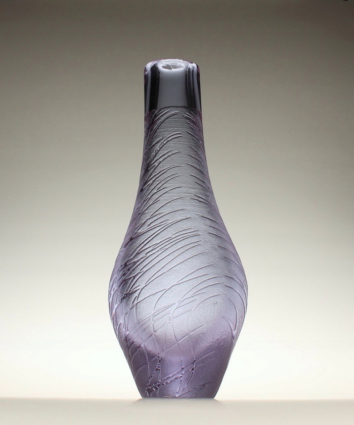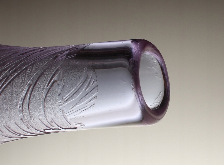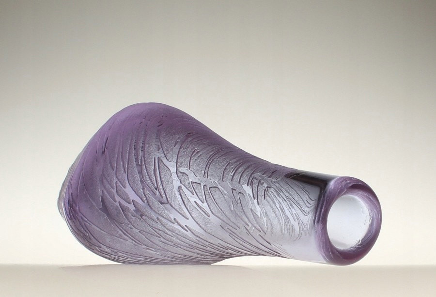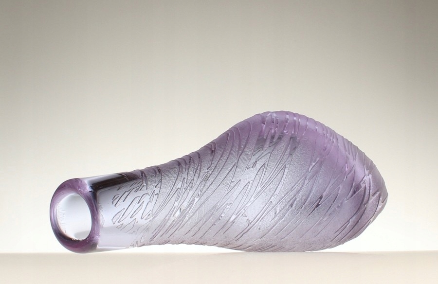 Ваза из неодимового стекла (при искусственном освещении синеет). Брюшко украшено диагональными неровными полосами. Матовая основа. Ваза была разработана Мирославом Клингером для Железнобродского стекольного завода. Чехословакия, 1980-е годы