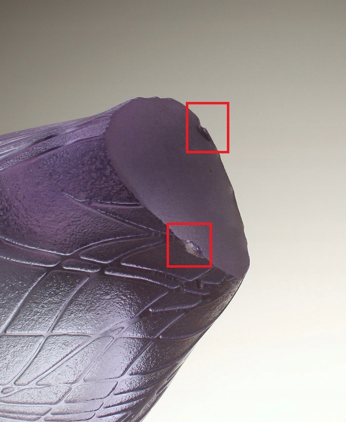 Интерьер чистый, без каких-либо следов. Край заливной горловины цел. Ниже края заливной горловины с внутренней стороны имеются неглубокие, гладкие заводские неровности, показанные на фотографиях. По краю основания имеются два микродефекта примерно по 5 мм каждый.