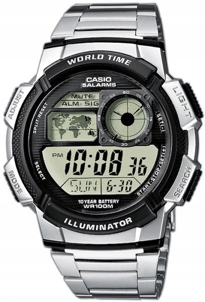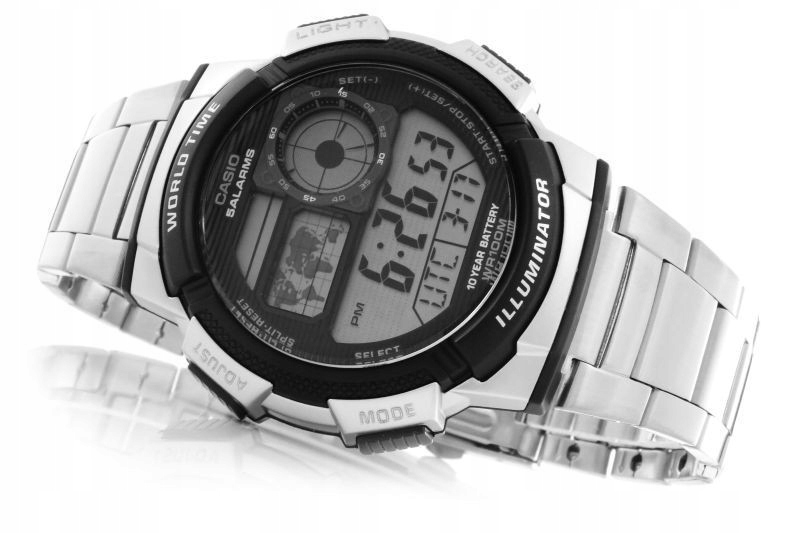 Кварцевые часы CASIO AE-1000WD-1A из спортивной коллекции отличаются высокой прочностью и водонепроницаемостью до 100 м, что позволяет плавать. Корпус помещен на стальной браслет, максимальная окружность (длина ремешка, измеренная вместе с корпусом) — 22 см. Модель AE-1000WD-1A имеет хезалитовое стекло. Дополнительные функции таймера включают автоматический календарь, 5 ежедневных будильников, сигнал полного часа, таймер, секундомер и мировое время. Сочетание спортивного характера с оригинальным внешним видом и простотой. Надежность, оригинальный и современный дизайн делают ее одной из самых интересных моделей спортивной коллекции Casio, и все это по очень низкой цене.