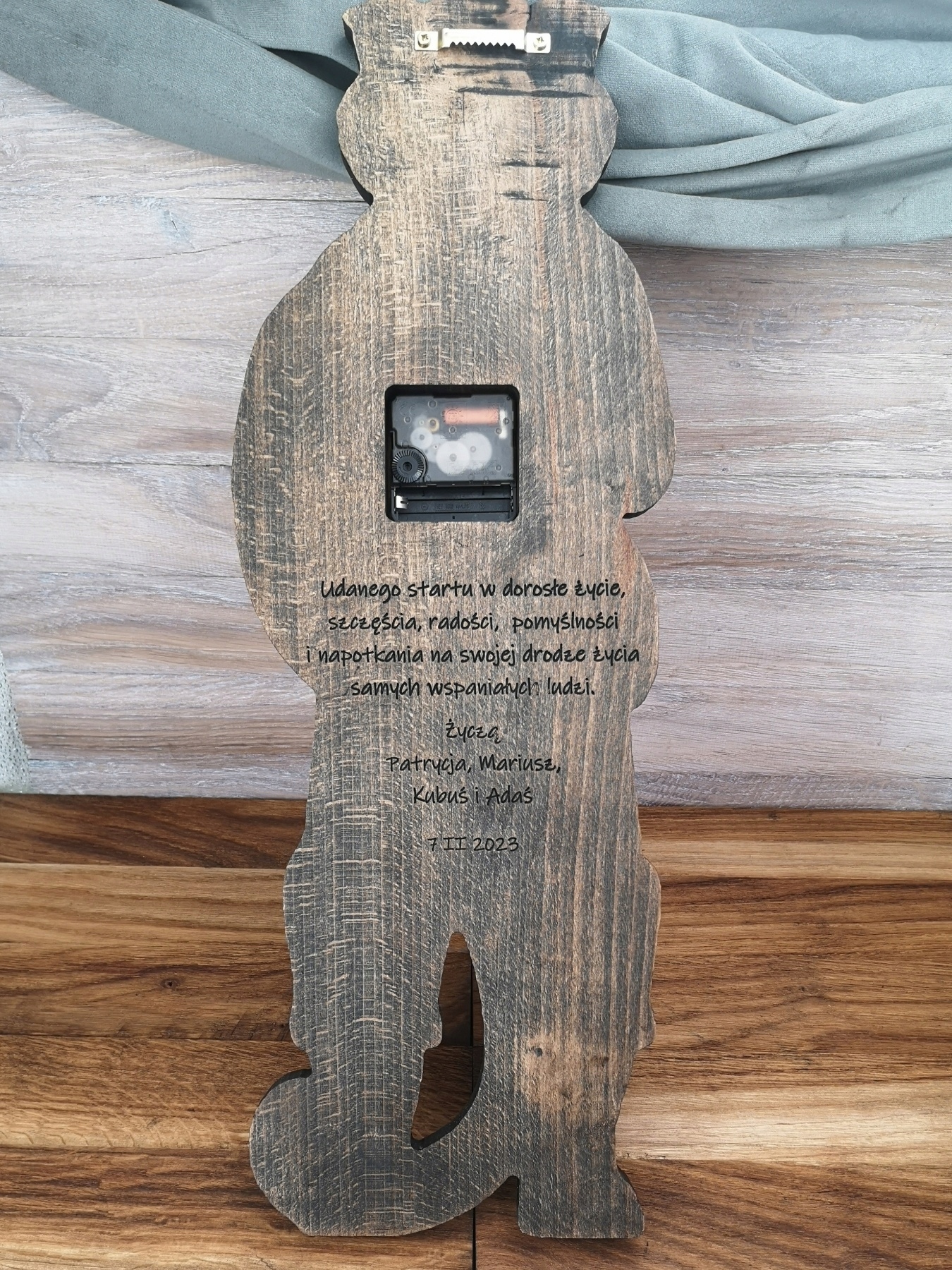 Размеры представленного изделия ок. 50x19 [см] окрашен в цвет венге и изготовлен из древесины бука, а также имеет посеребренные цифры и бакенбарды.