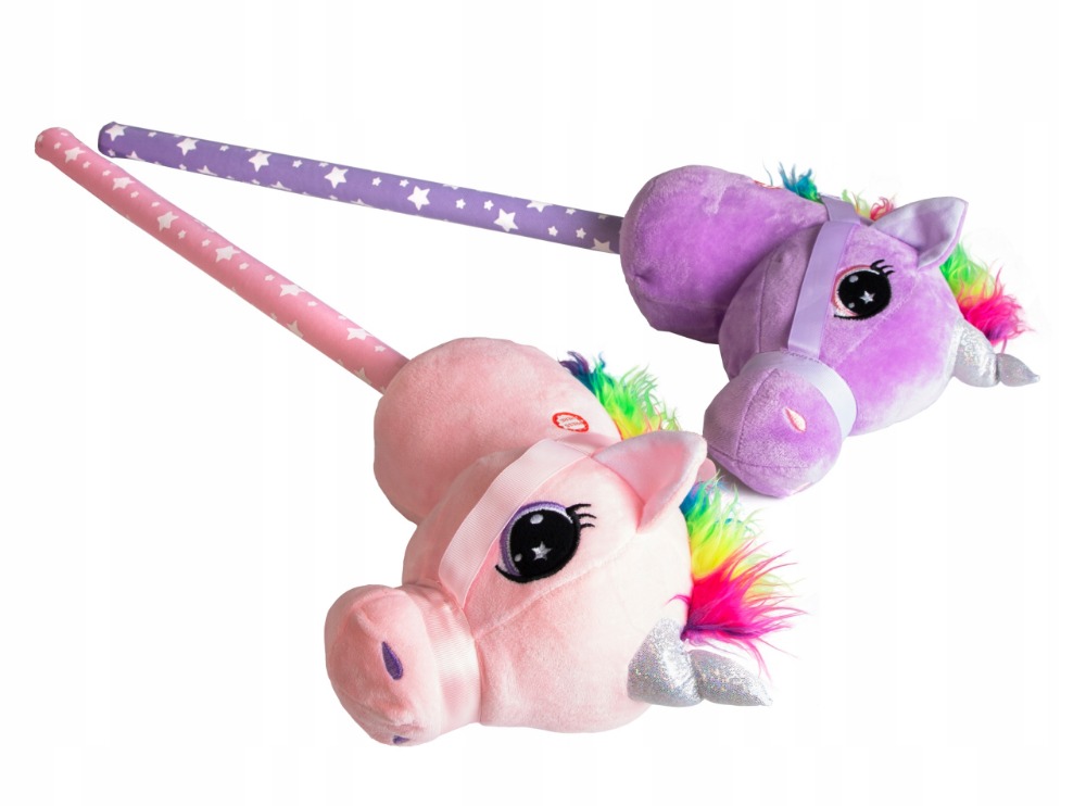 ГОЛОВА ЕДИНОРОГА НА ПАЛКЕ, идеально подходит для подвижных игр и прыжков через препятствия. Играя, ребенок имитирует езду на лошади. У единорога грива, красивые глаза, светло-фиолетовый окрас и радужная грива. У единорога есть уздечка, закрепленная на липучке, за которую ребенок может ухватиться. Выбирайте белые звезды. Когда вы нажимаете кнопку, единорог издает звуки цокота копыт, ржания и фырканья. мягкий единорог из плюша.