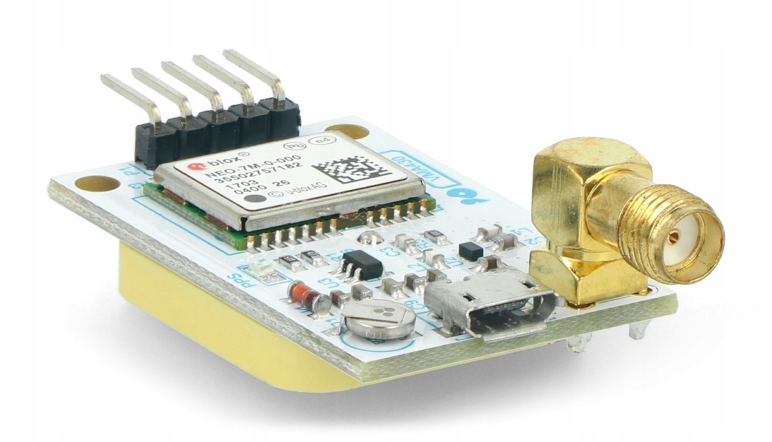МодульGPS / ГЛОНАСС НЕО-7М на плате с установленными позолоченными разъемами. Он поддерживает56 каналов, работает с напряжением от 3,3 В до 5 В, осуществляет связь через интерфейс UART (TX, RX), частота обновления составляет до 5 Гц.