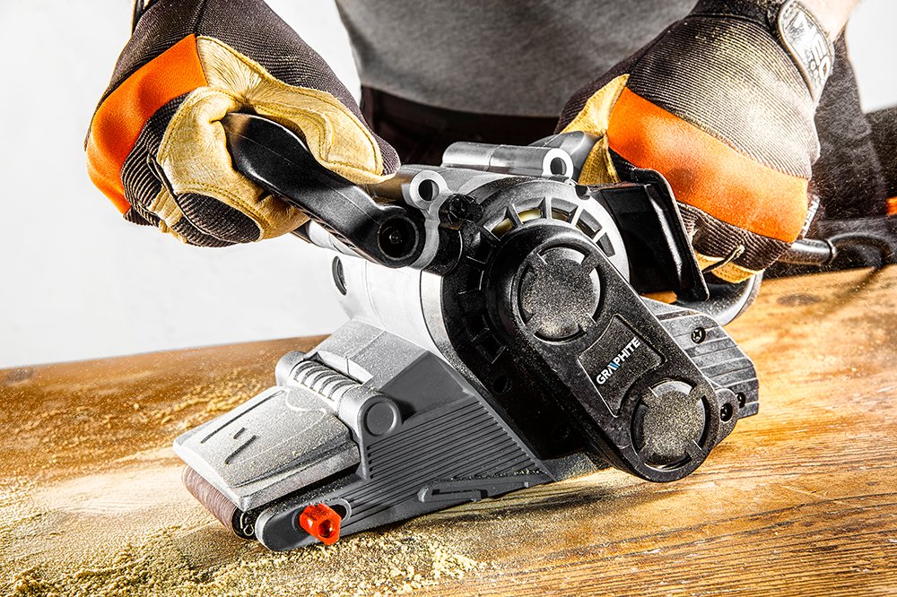 Специализированная ленточная шлифовальная машина ГРАФИТ мощностью 800 Вт, предназначенная для обработки деревянных и древесноподобных материалов, металла и пластика. Устройство отличается эргономичной формой и современным дизайном, имеет противоскользящую накладку на основной ручке и дополнительную ручку с возможностью быстрой регулировки угла наклона. Направляющий ролик шлифовальной машины изготовлен из жаропрочного и устойчивого к повреждениям алюминиевого сплава. Небольшой диаметр переднего ролика (16,5 мм) позволяет шлифовать труднодоступные места. Кроме того, устройство имеет возможность блокировки переключателя для непрерывной работы и возможность наклона крышки ремнябез конца. Максимальная скорость ленты составляет 260 метров в минуту. В комплект к болгарке входит пылесборник и ремень без конца размером 75х457 мм. Соответствие европейским стандартам подтверждено сертификатом CE