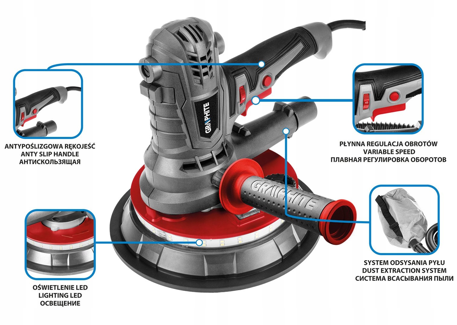 Шлифмашина для гипса 900 Вт, 180 мм, LED 59G263 ГРАФИТ — высококлассный аппарат для обработки гипсовых поверхностей с удобной светодиодной подсветкой, позволяющей выполнять точные задачи. Шлифмашина имеет мощность 900 Вт и возможность плавной регулировки вращения головки в диапазоне от 1400 до 2700 об/мин. Диск шлифовальной машины имеет диаметр 180 мм.