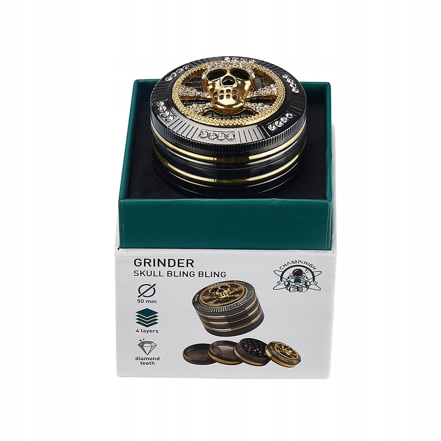 Измельчитель представлен в премиум версии с интересным дизайном. и уникальное украшение. Крышка кофемолки украшена золотым черепом и кристаллами. Состоит из четырех частей.
