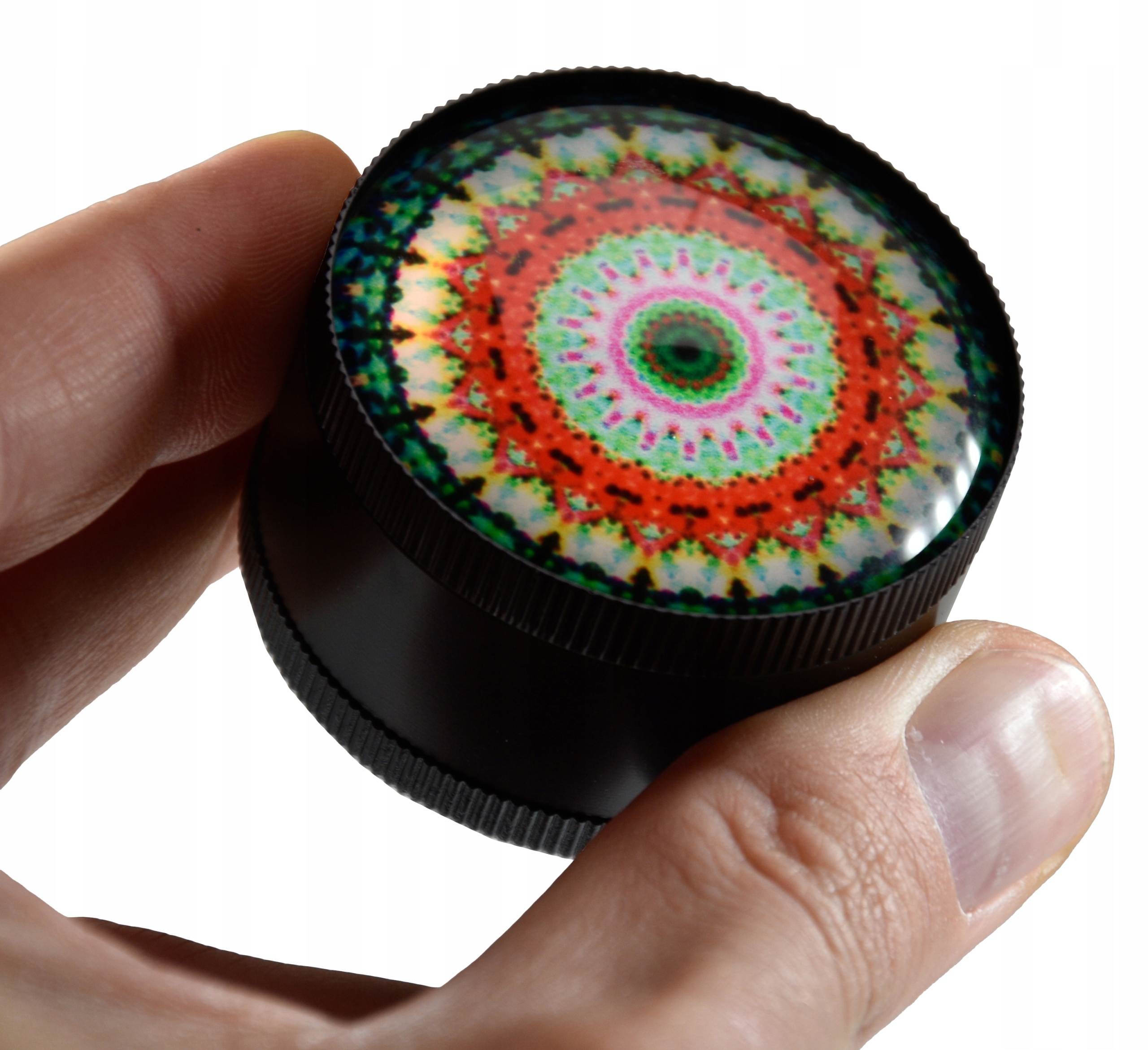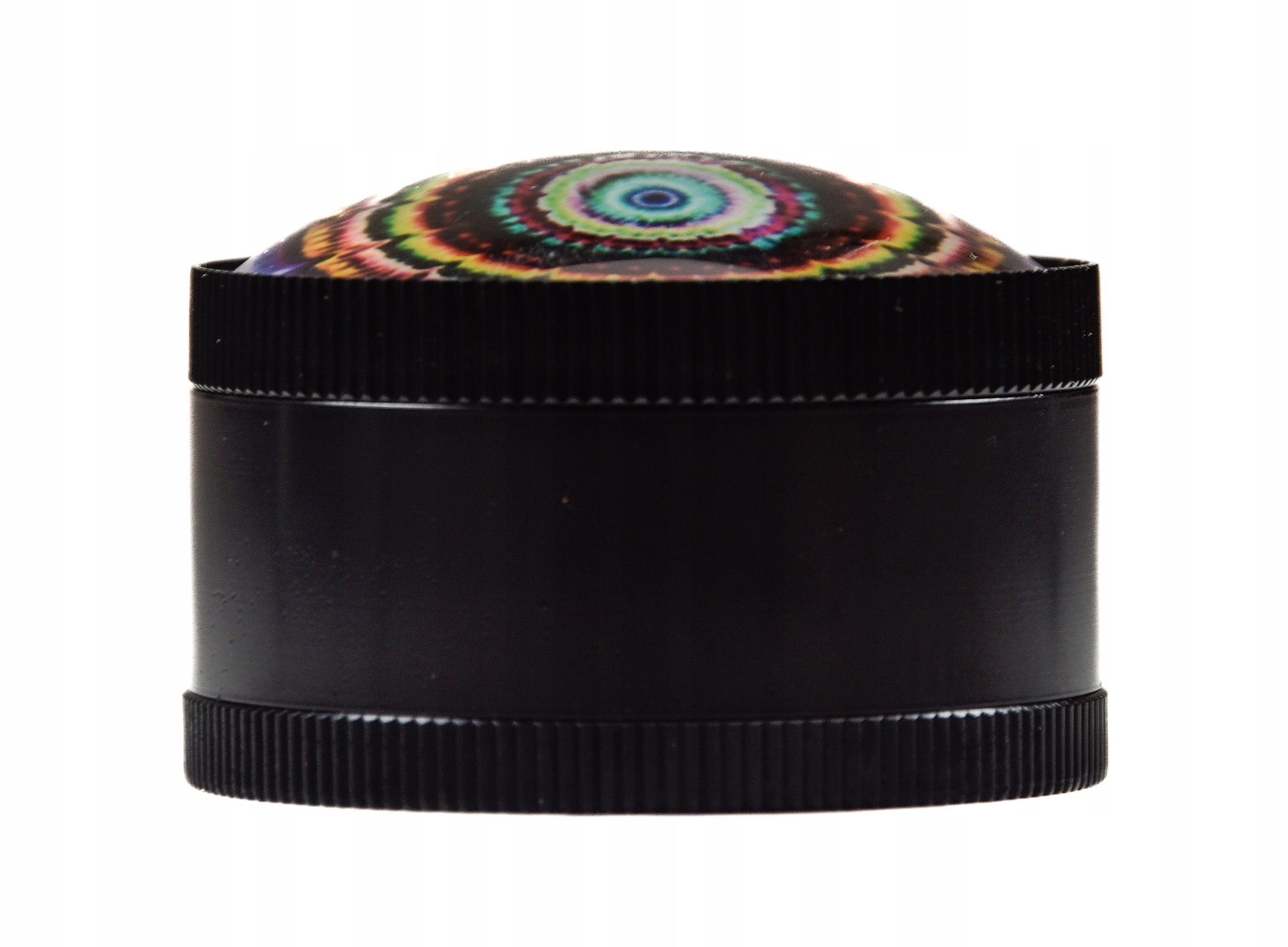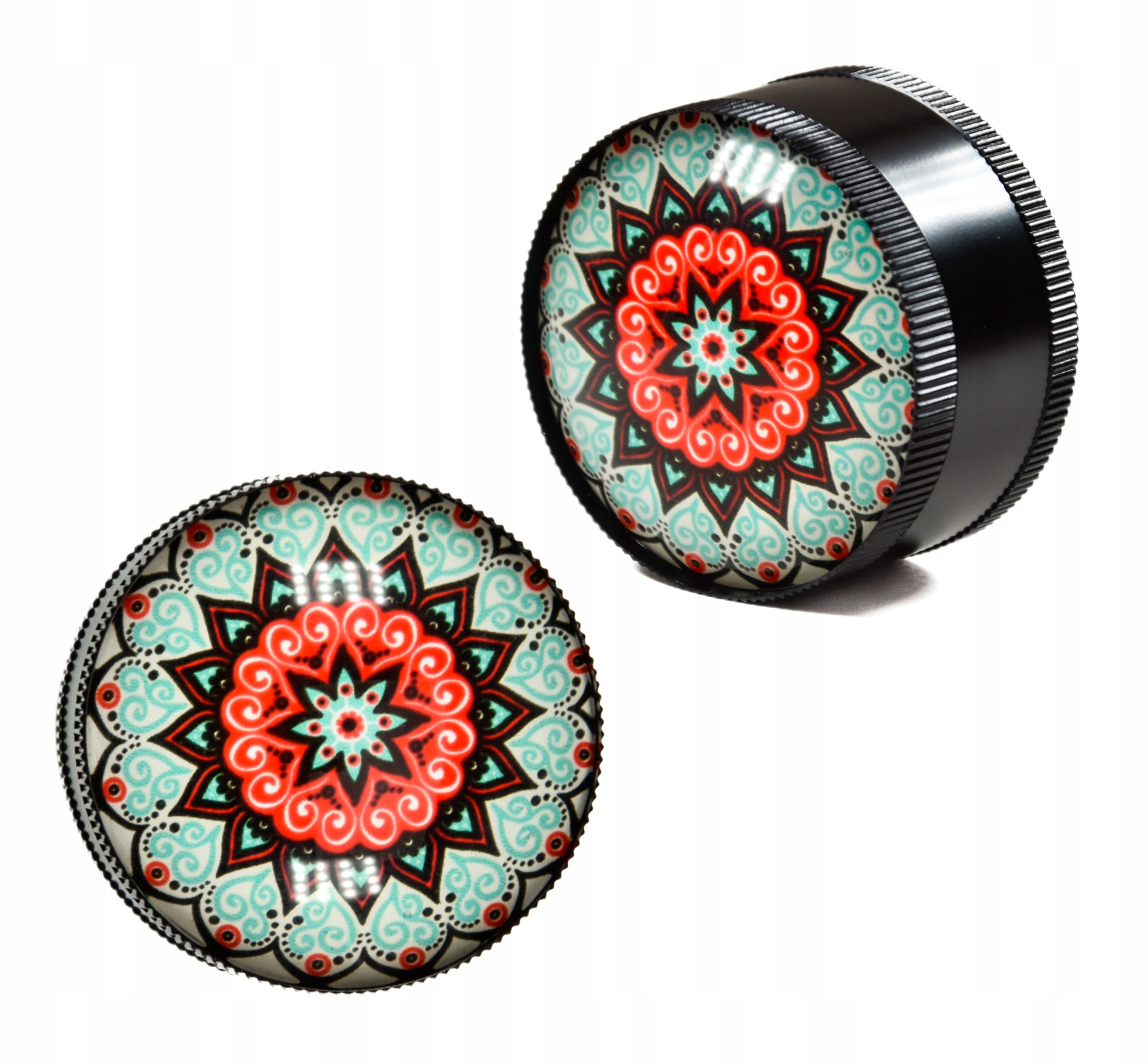 - Красивая кофемолка диаметром 50 мм, оформленная в стиле Мандала, имеет красивую выпуклую крышку из стекла.