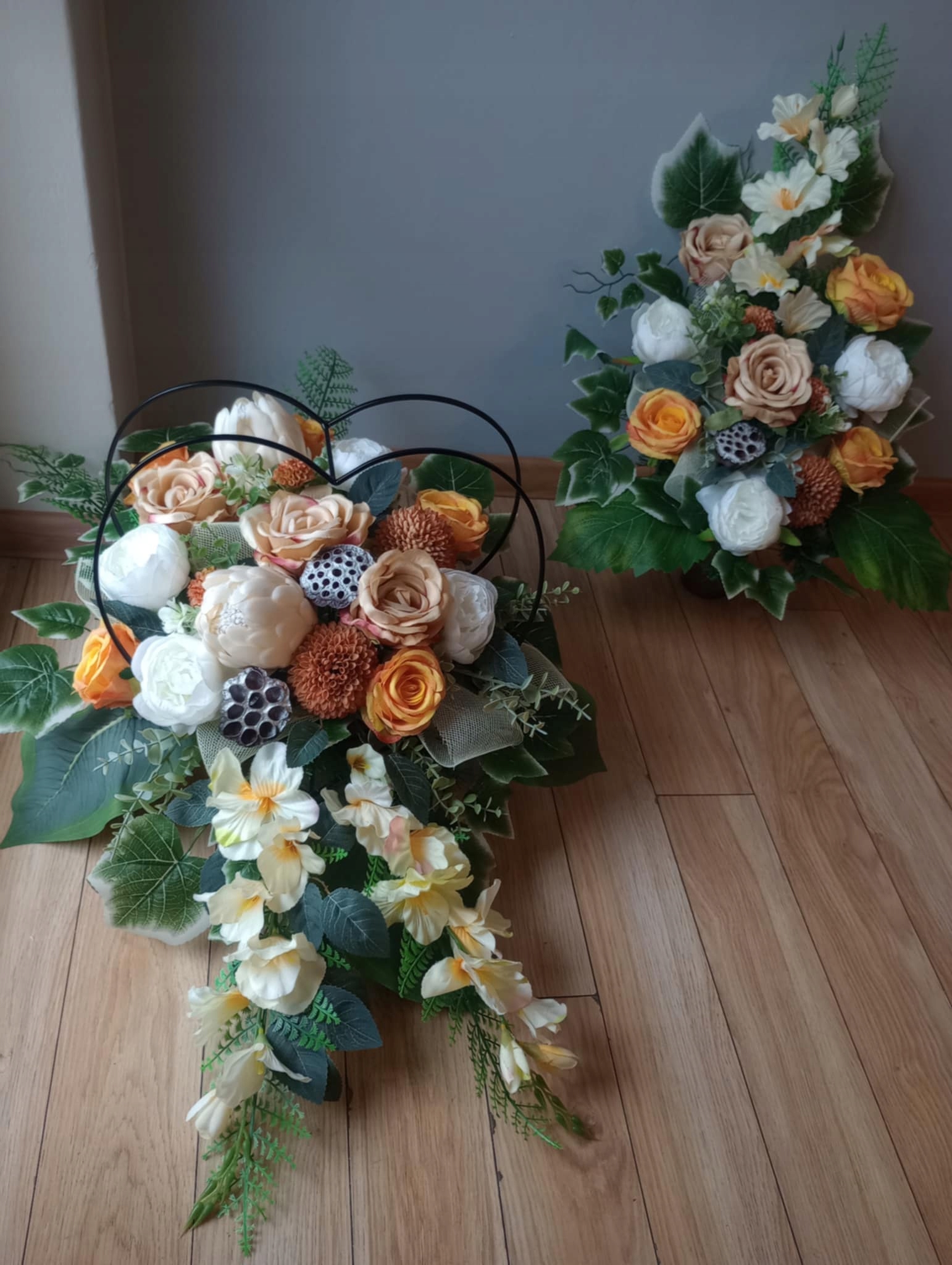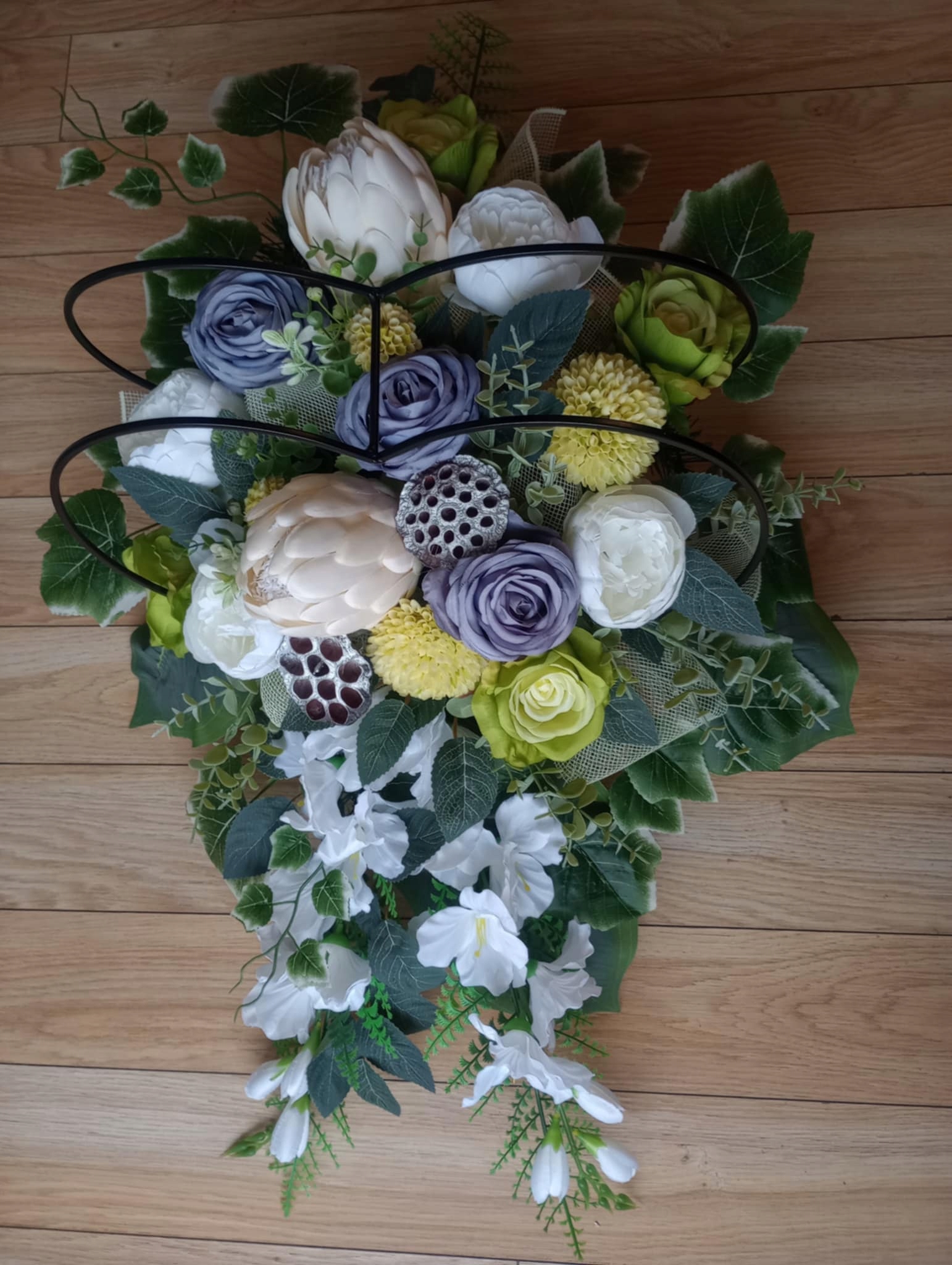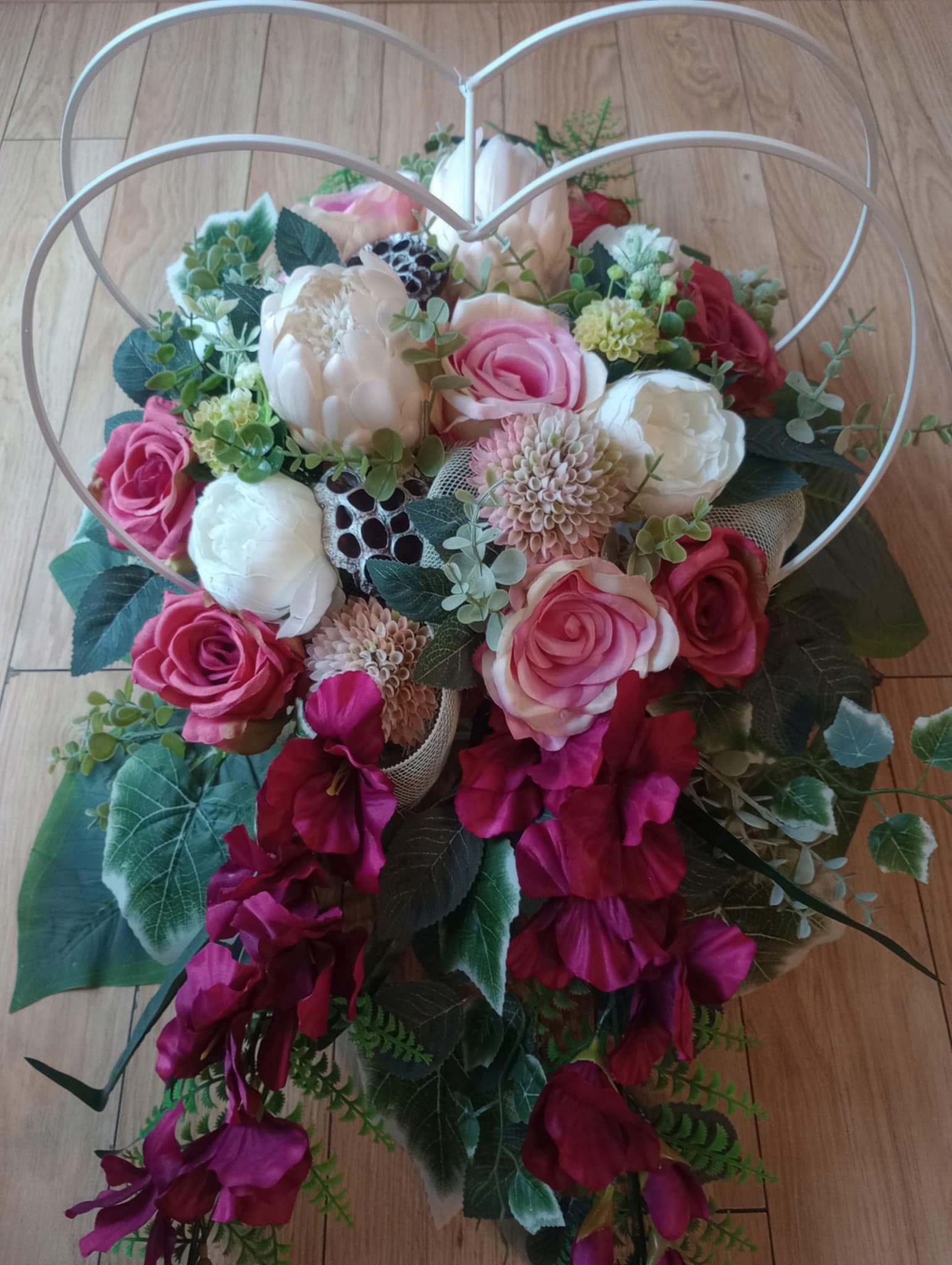 Искусственный состав (так называемый головной убор, икебана) с сердцем изготовлен из искусственной резины в пластиковой стабильности. Деонация дает ей правильный вес, который предотвращает скольжение могилы. Композиция прибл. 80 см в длину и шириной 50 см