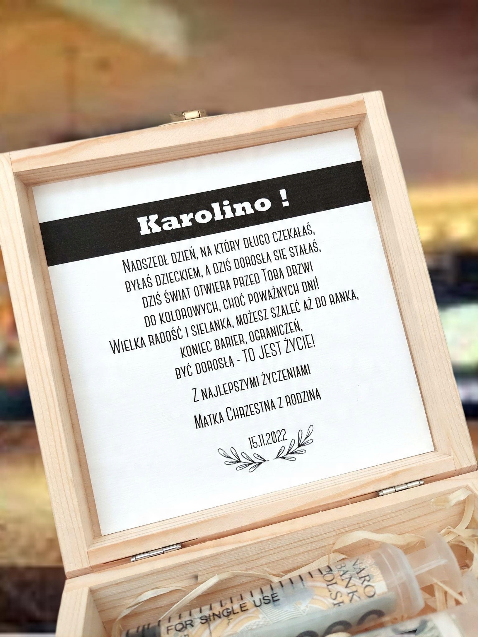 Легкий сосновый деревянный ящик с 5 шприцами, в которые закатываем и кладем определенную сумму. Внутри пожелания - 35 стихотворений на выбор.