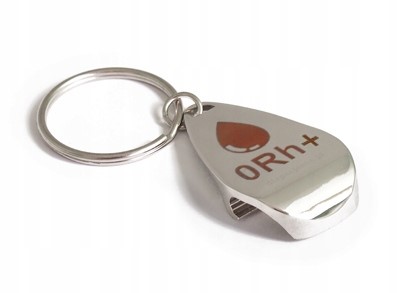 На кольце ключа есть ржавая красная гравировка капель крови, группы крови и обозначения логотипа. RH+