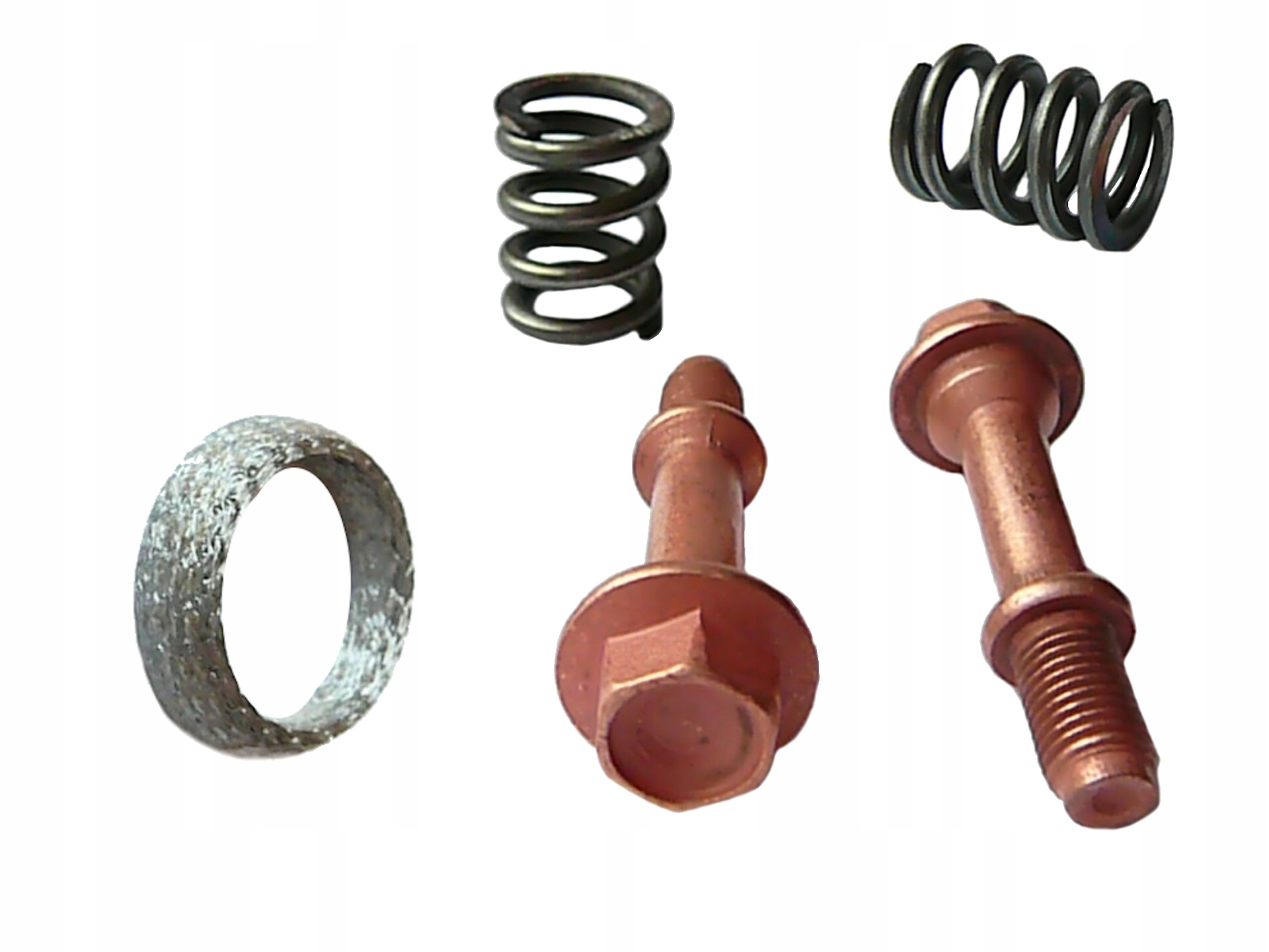 Представляю ремкомплект выхлопной системы, в который входят два винта, пружина и кольцо. Весь комплект используется для соединения патрубка глушителя с коллектором в автомобилях: