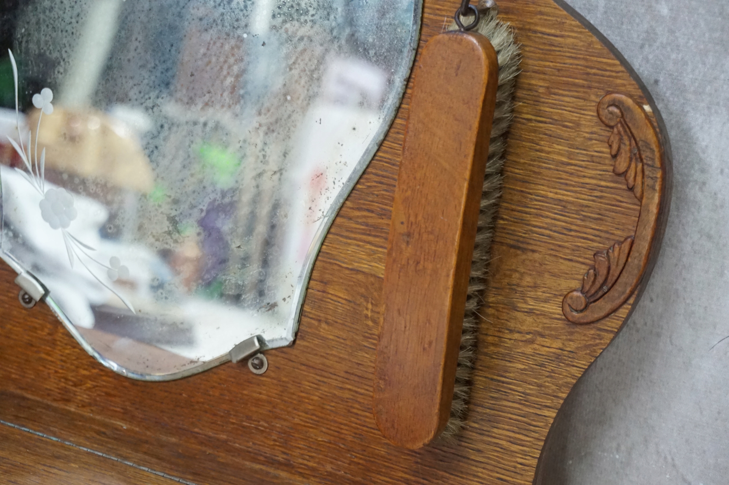 чудесное зеркало с деревянной рамой, тумбой и двумя щетками для одежды