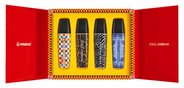 - DOLCE&GABBANA — идеальный декоративный элемент для любого письменного стола. В издание входят хайлайтеры следующих цветов: Cloudy Blue, Milky Yellow и Beige, а также черный маркер. Каждый цвет украшен уникальным узором – конечно же, в культовом стиле DOLCE&GABBANA.