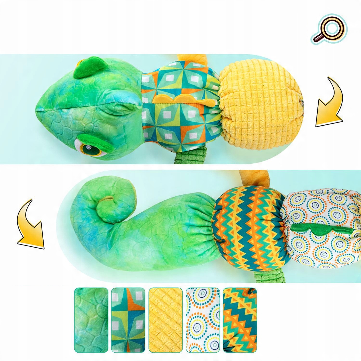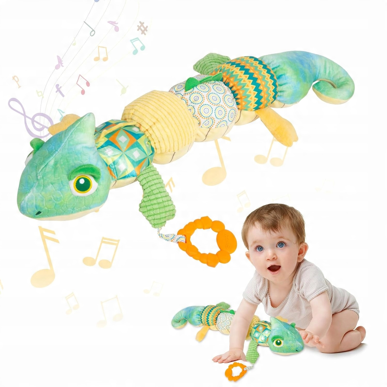 👍👍Игрушки 4 в 1 - В этом очаровательном хамелеоне мы совместили веселье с прорезывателями, погремушками, музыкальными игрушками и мягкими игрушками. В комплект входит 1 музыкальная шкатулка; 1x погремушки; 1 пищалка BB; 2 мятой бумаги; 1 прорезыватель.