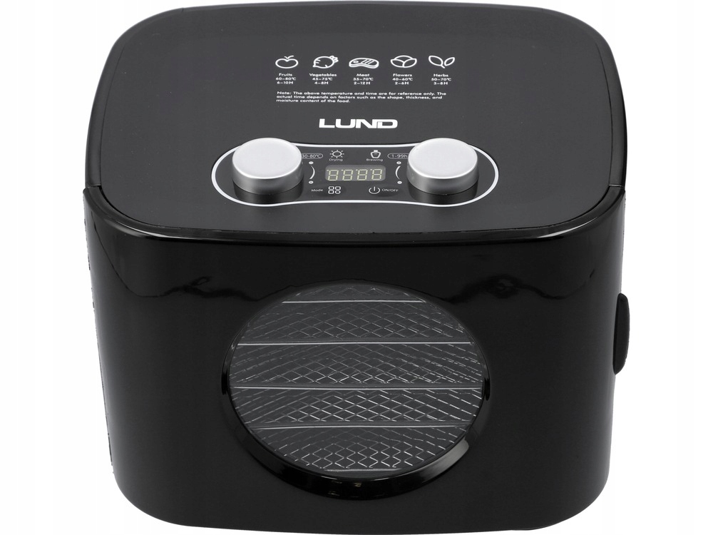 - Графика в верхней части корпуса с представленным показательным временем и температурой сушильных фруктов, овощей, мяса, цветов и трав