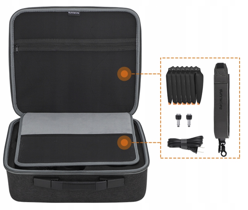 Корпус многократно усилен, что гарантирует его высокую устойчивость к механическим повреждениям. Внутренний слой, в котором мы размещаем дрон, пульт дистанционного управления и дополнительные аксессуары, такие как аккумуляторы, обеспечивает высокая безопасность и гасит вибрации, что гарантирует полностью безопасное хранение оборудования.