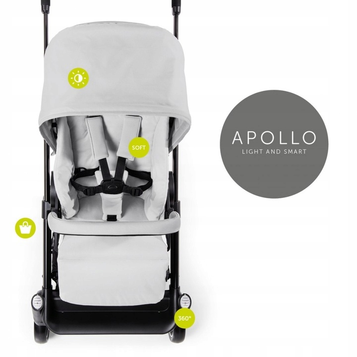 Широкая и элегантная коляска с мягкими и уютными тканями, его можно сочетать с детским носителем и размером с сиденья. Коляска Аполлона особенно легкая, поэтому она является идеальным компаньоном отличных поездок в город.