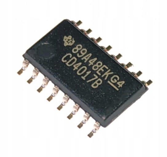 Счетчик Джонсона с 10 декодируемыми выходами. Входы включают сигналы CLOCK, RESET и CLOCK INHIBIT. Работа триггера Шмитта во входной цепи CLOCK обеспечивает формирование импульса, позволяющее неограниченное время нарастания и спада тактового входного импульса. Эти счетчики увеличиваются на один счет при положительном переходе тактового сигнала, если сигнал CLOCK INHIBIT имеет низкий уровень. Продвижение счетчика по линии синхронизации блокируется, когда сигнал CLOCK INHIBIT имеет высокий уровень. Высокий сигнал RESET сбрасывает счетчик в ноль. Использование конфигурации счетчика Джонсона обеспечивает быструю работу, стробируемое декодирование с двумя входами и безимпульсный декодированный выход. Предусмотрена антиблокировочная заслонка, обеспечивающая правильную последовательность подсчета. Декодированный выходной сигнал обычно низкий и достигает высоких значений только в соответствующем декодированном временном интервале. Каждый декодированный выходной сигнал остается высоким в течение одного полного тактового цикла. Сигнал CARRY-OUT завершает цикл каждые 10 тактов тактового входа CD4017B и используется для тактирования следующего устройства в цепочке счета нескольких устройств. CD4017B поставляется в небольшом корпусе на 16 выводов (суффикс NSR).