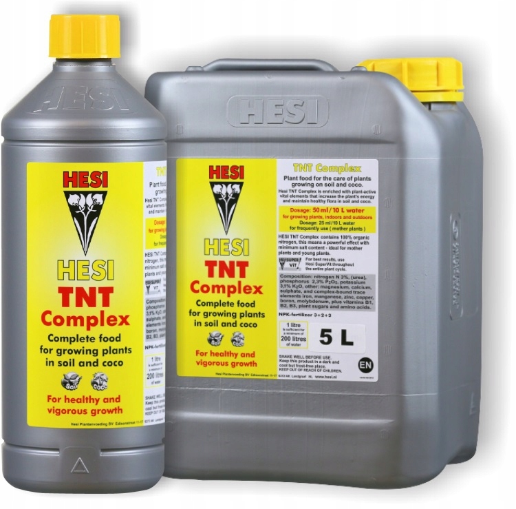 Азоторганические соединения не имеют значения ЕС, поскольку они не являются солями, но содержат высокий процент азота и степень их эффективности очень высока. Комплекс Hesi TNT содержит все необходимые питательные вещества и обогащен множеством важных ингредиентов (витаминов, аминокислот и т. д.), гарантирующих успешный рост. Растения, удобренные Hesi TNT Complex, развиваются сильно и мощно, а также имеют здоровый зеленый цвет. Не превышайте дозу TNT Complex, так как это приведет к тому, что растение вырастет слишком высоко и в конце цикла будет использовать слишком много энергии для транспортировки питательных веществ от корней к верхушкам.