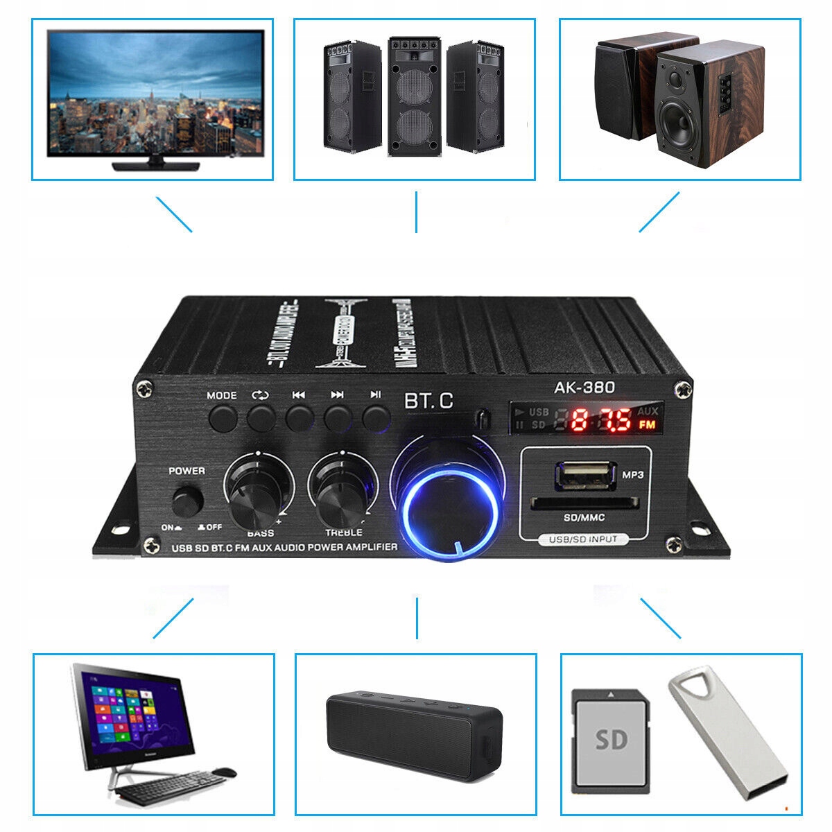 Мини-усилитель звука Bluetooth широко совместим с мобильными телефонами, компьютерами, планшетами, ноутбуками, MP3, MP4, телевизорами и проекторами с AV-звуком. и т. д. Вы можете использовать его дома, брать с собой в машину или на улицу.