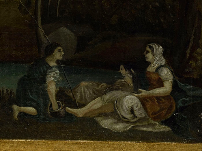 Старая картина XIX века «Релаксация у реки», масло