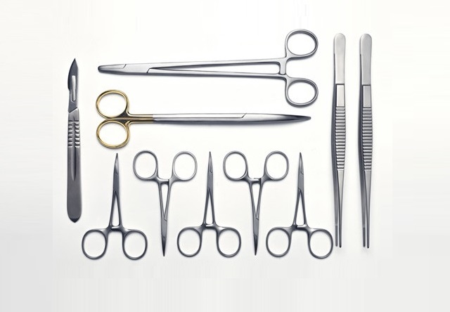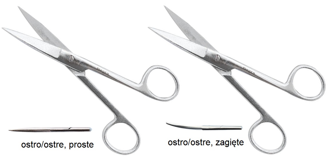Ножницы применяют для разрезания и подготовки тканей, краев кожных ран, а также для обрезки лишних нитей после наложения швов. Изогнутый вариант чаще используется при смене повязок, поскольку изогнутые лезвия снижают риск застревания иглы.