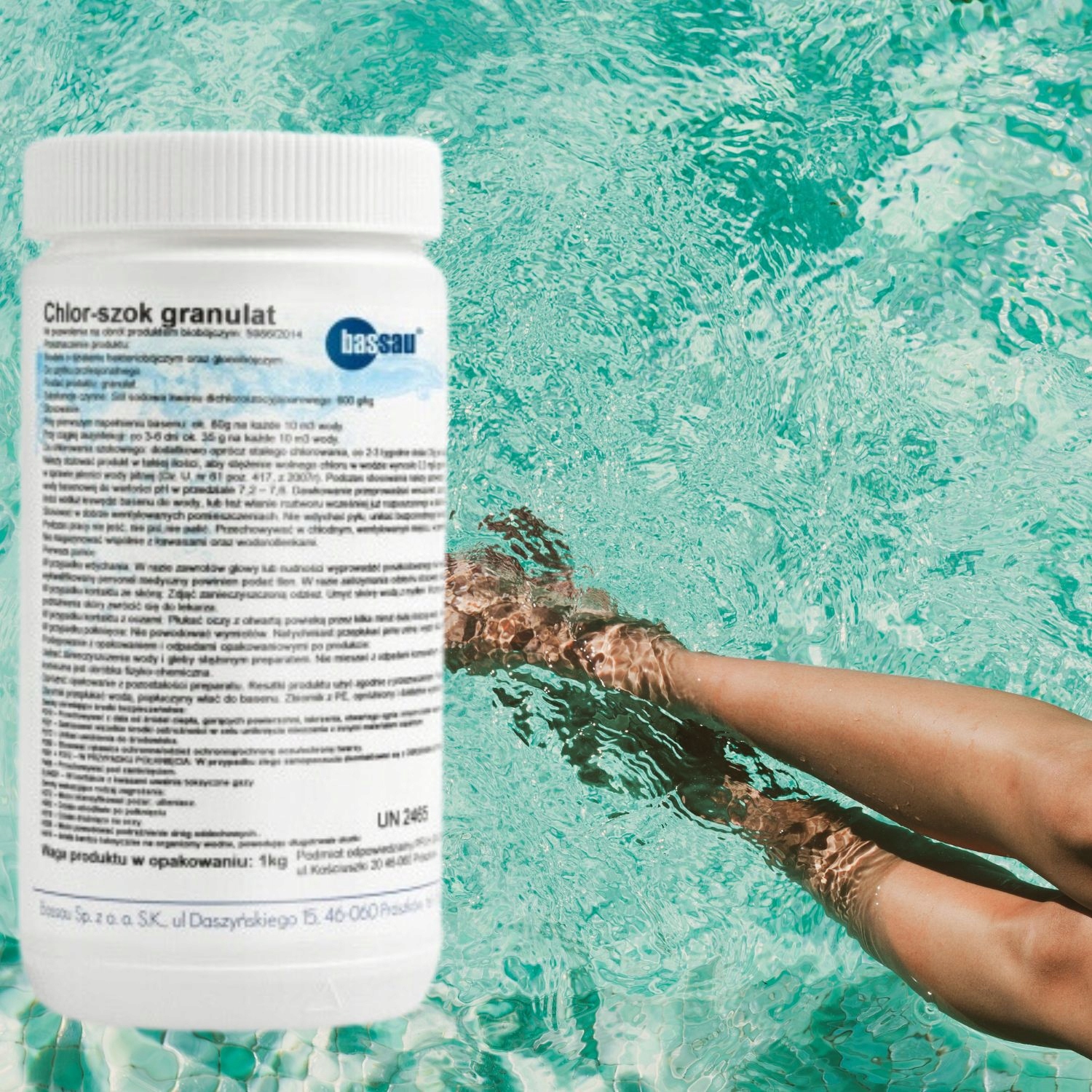 Хлор-шоковые гранулы 1 кг для дезинфекции и ударного хлорирования джакузи и бассейнов.