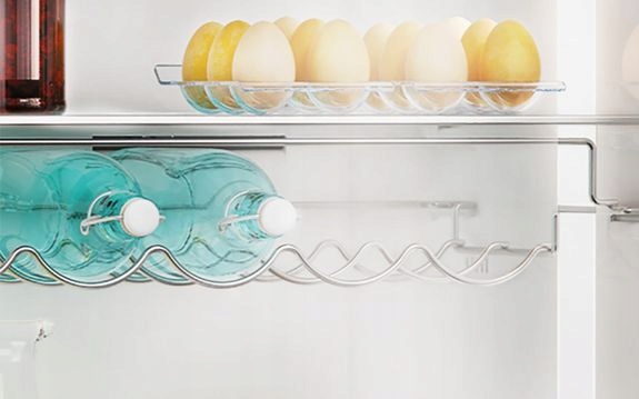 Хромированная съемная полка для бутылок предоставит вам дополнительное место для хранения этих контейнеров. Если она вам не нужна, вы можете убрать полку одним движением, освободив место для более высоких контейнеров или посуды.