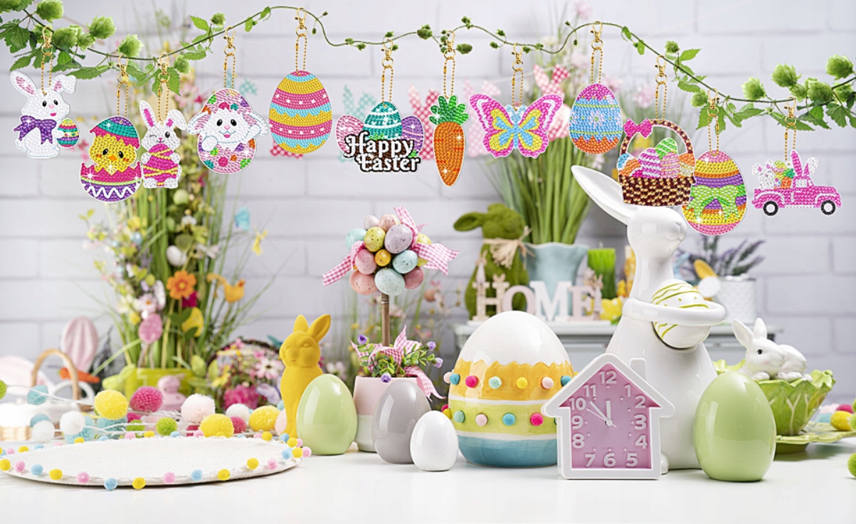 ➡️ Набор бриллиантовых подвесок – идеальное украшение к Пасхе! Используйте их в качестве подарочных ярлыков, поздравительных открыток или весенних украшений для вашего сада, балкона или окна. Также ими можно украсить брелки или сумки. Это современные и уникальные украшения, которые привнесут весеннюю атмосферу в любой интерьер.