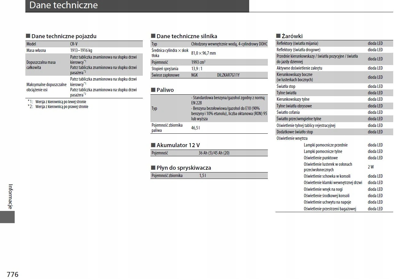 Руководство пользователя Honda содержит все версии оборудования и полезную информацию о том, как эффективно и безопасно использовать автомобиль, например: - индикаторы, контрольные лампы, открывание и закрывание - освещение и видимость, сиденья, отсеки для хранения вещей, отопление, вентиляция, кондиционирование воздуха. - советы по вождению, эксплуатации, обслуживанию автомобиля - уровни жидкостей, проверка и доливка, аварийные операции, замена колес, предохранителей, замена лампочек - технические данные... и многое другое, дающее путешественникам ощущение безопасности и комфорта. Польское законодательство обязывает продавца приложить к автомобилю руководство по эксплуатации на польском языке. Руководство к автомобилю новое, на польском языке.