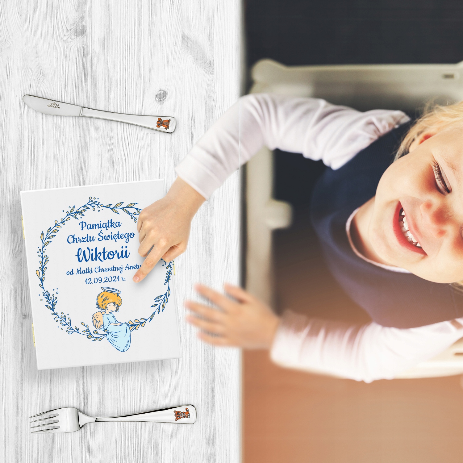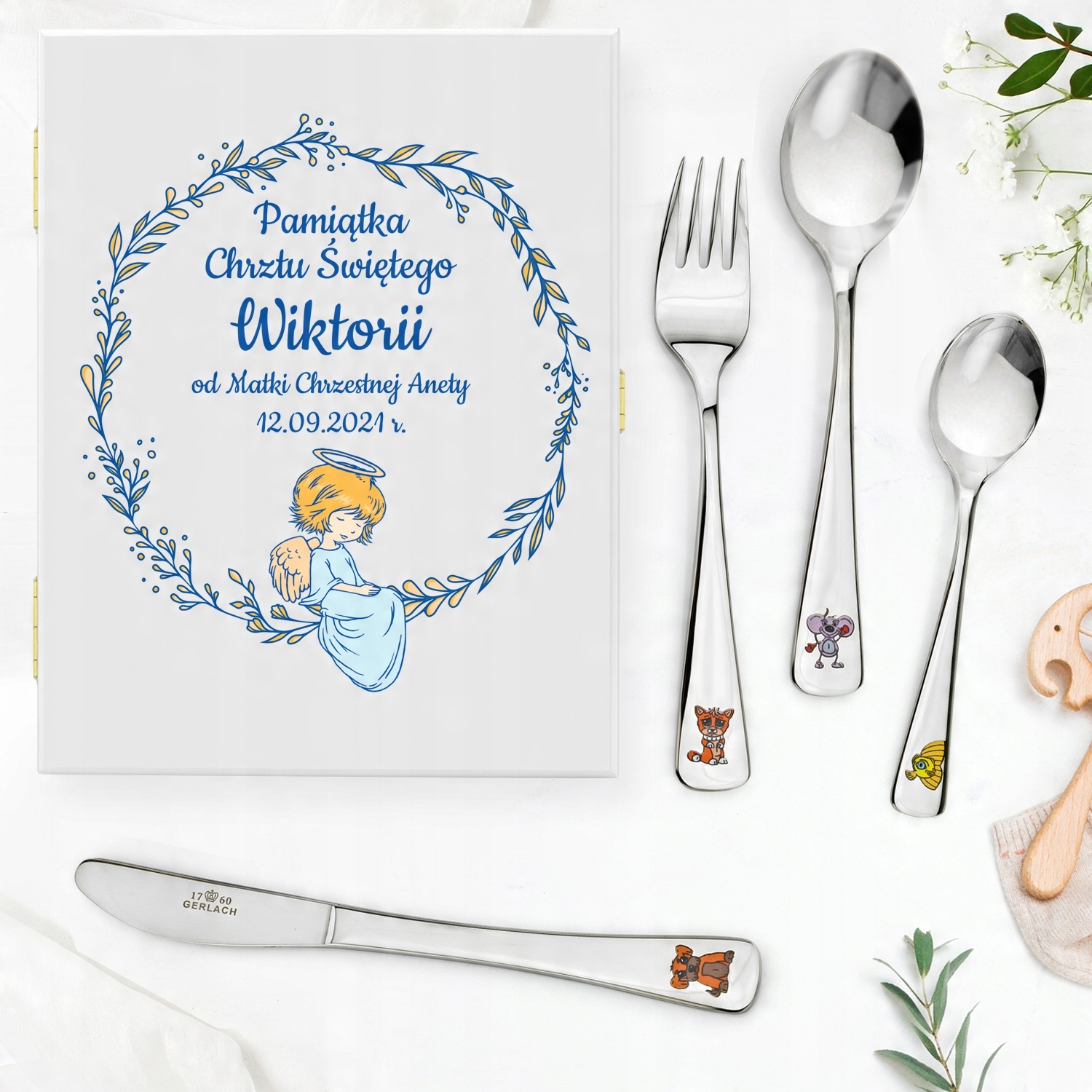 Ищете уникальный подарок своему крестнику или крестнице по случаю Святого Крещения или первый день рождения, который поможет ему научиться есть самостоятельно и при этом станет уникальным сувениром? Если да, то мы можем предложить вам уникальный набор столовых приборов, упакованный в деревянную коробку, а также сделаем на коробке персонализированную красочную печать. На каждом столовом приборе будет индивидуальная гравировка.