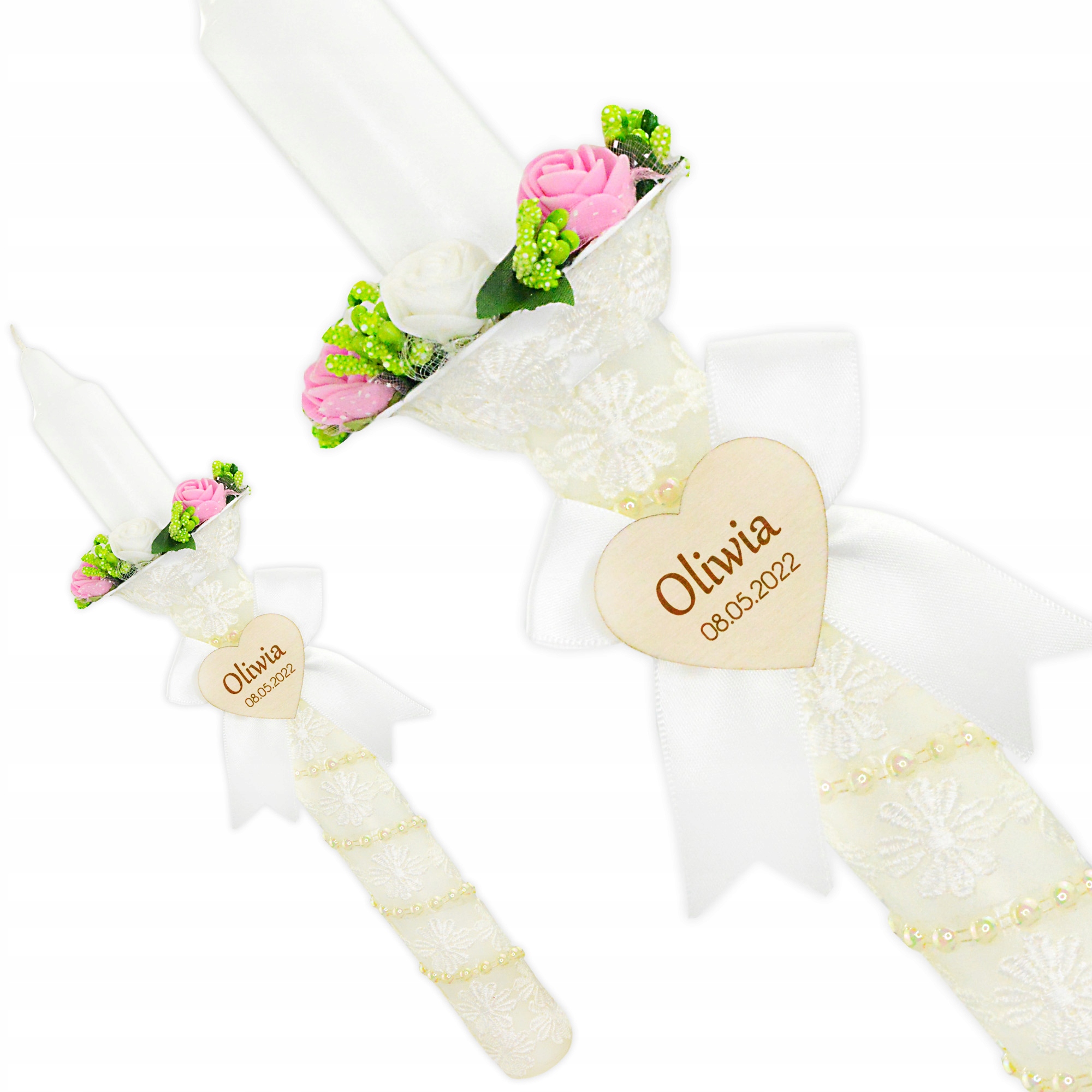Свеча украшена эффектным капельником, который украшен декоративной деталью и красивый кулон с именем и датой ребенка.