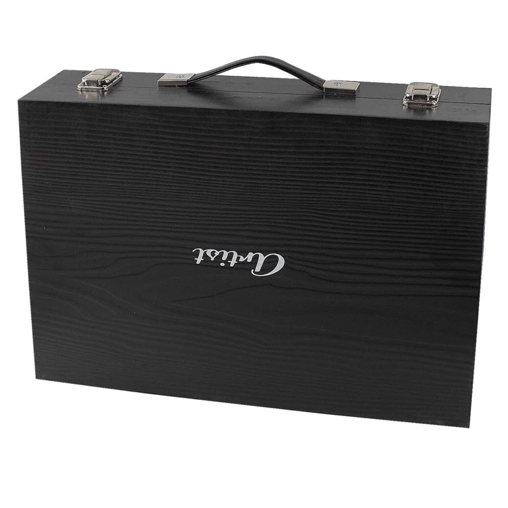 Храните принадлежности для рисования в профессиональном деревянном футляре.