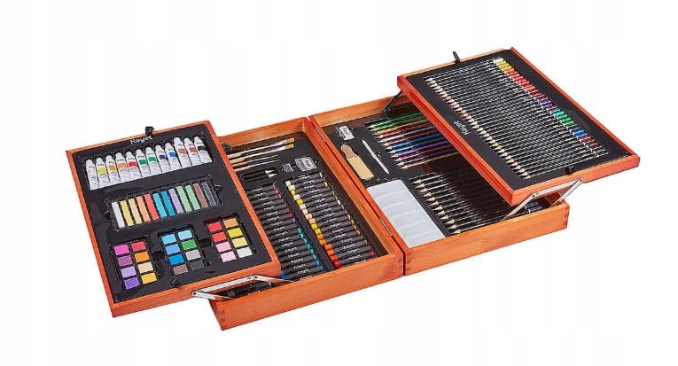 Арт-набор KAYET представляет собой стильный деревянный чемоданчик с ручкой для хранения аксессуаров. Весь набор очень большой, так как содержит целых 180 различных элементов, как для живописи, так и для рисования. В комплект входят, среди прочего: масляная и сухая пастель, карандаши, акриловые краски в тюбиках, акварельные краски в кубиках и многие другие аксессуары. Все было сделано тщательно и с вниманием к каждой детали. Это отличный набор для начала вашего творческого приключения.