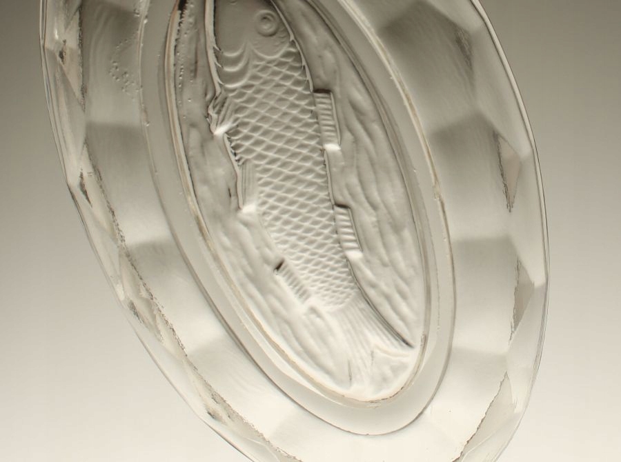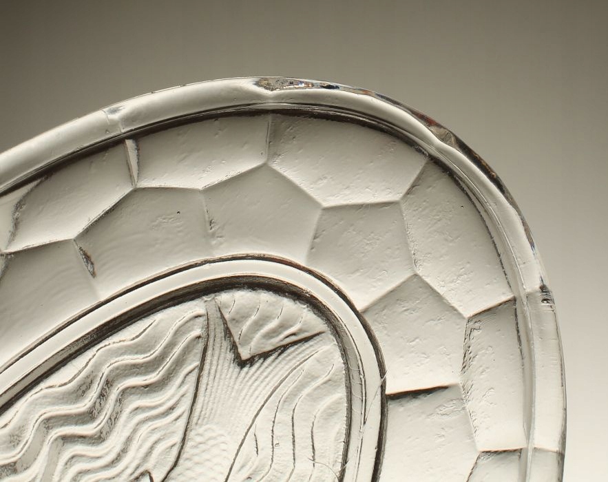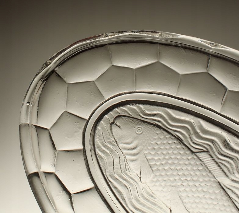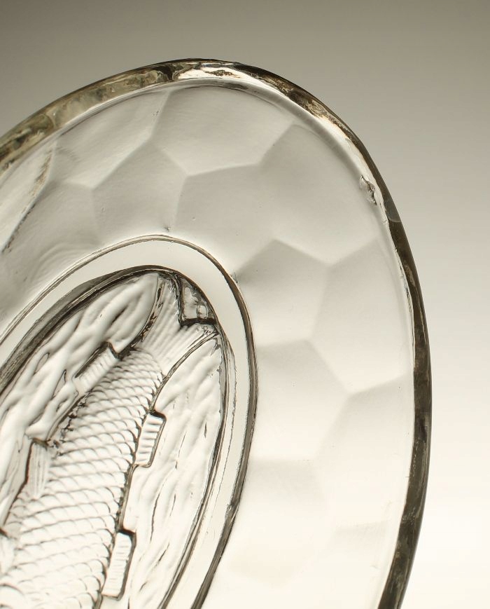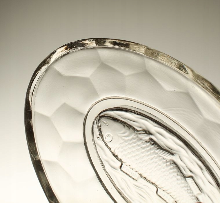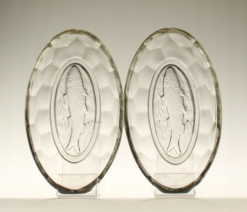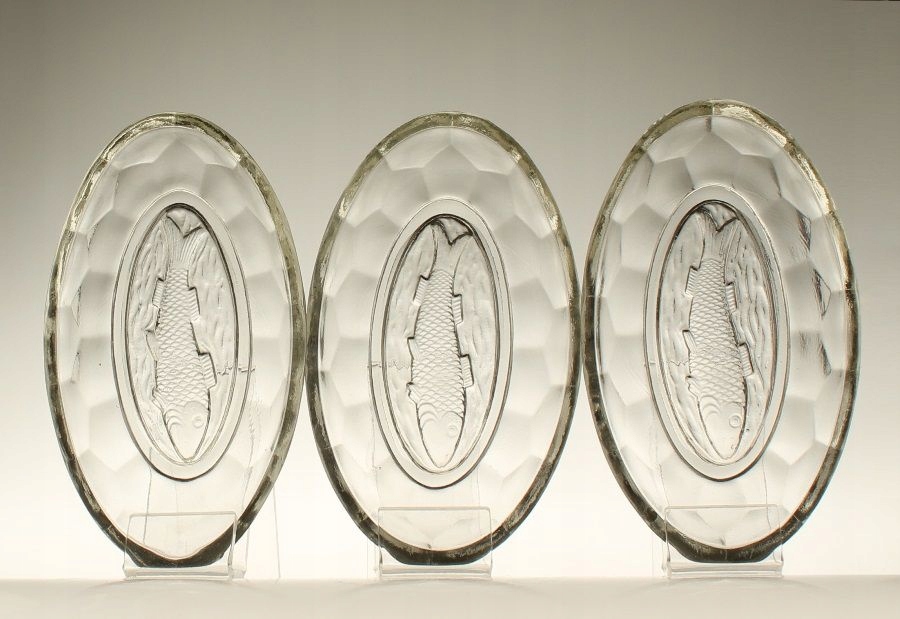 Набор подставок для сельди из бесцветного прессованного стекла (1 большая и 5 маленьких) с рельефный мотив рыбы. Они производятся на Хозяйственном стекольном заводе «Гортензия» в Петркуве-Трыбунальском. В каталоге 1936 года. Майский номер 124.