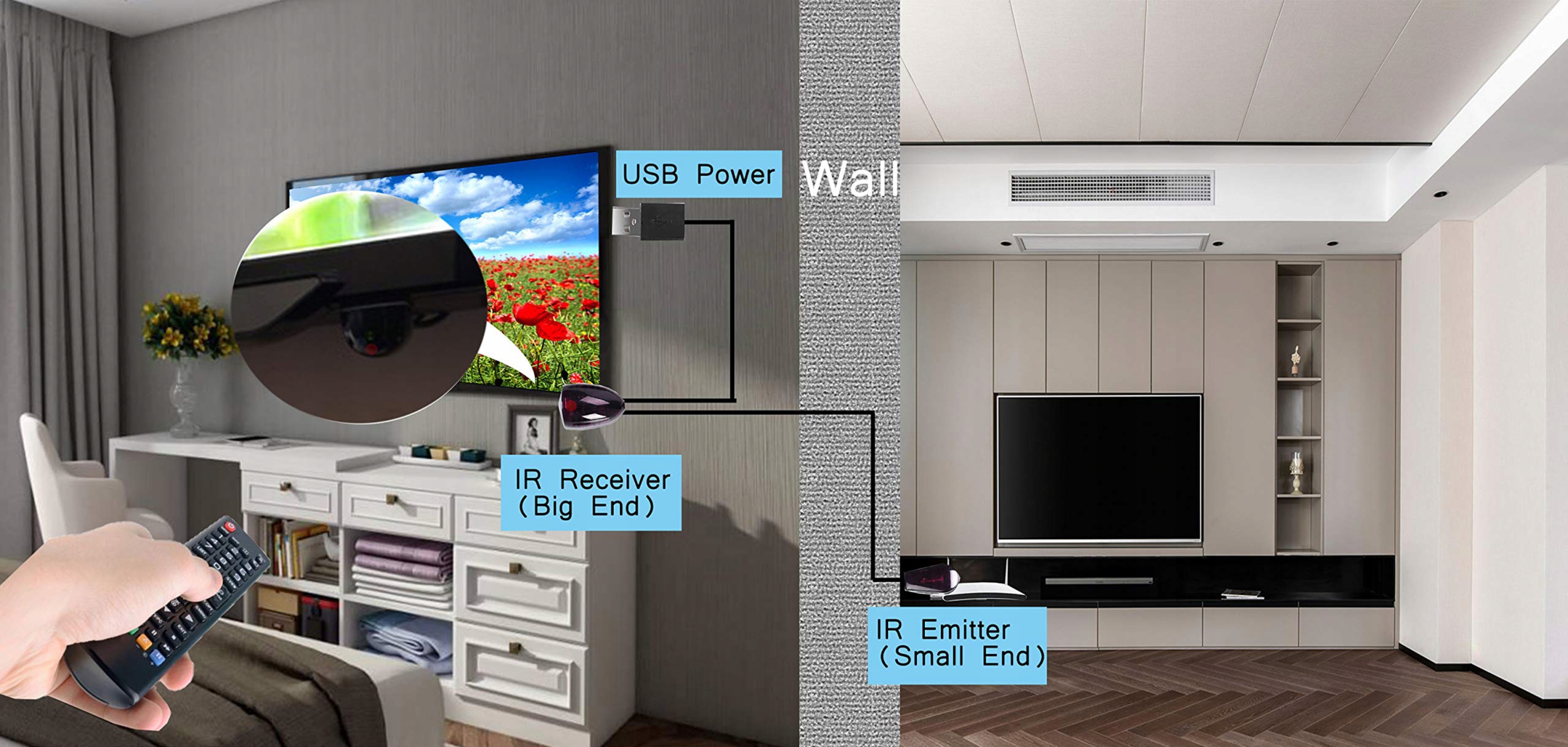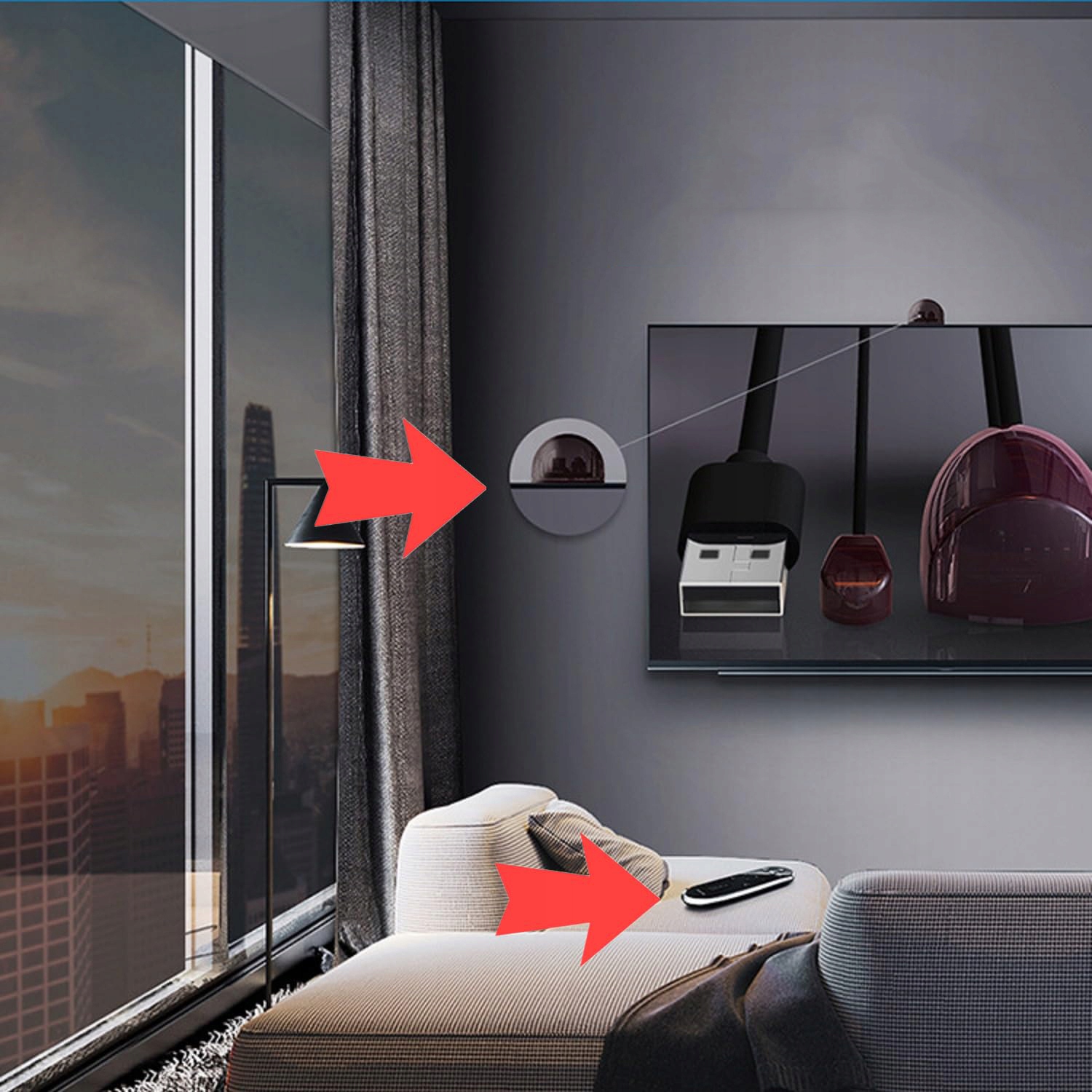 Легко в использовании ➡ подключить USB к телевизору, декодера или 5 -V источник питания на стенах (источник питания не включен), чтобы обеспечить питание, а затем приклеить инфракрасный передатчик (меньший конец), используя свой собственный клей на устройстве с инфракрасным датчиком, который вы хотите контролировать (до 10 см /3,9 дюйма). Наконец, поместите инфракрасный приемник (больший конец) в линию прицела пилота (до 10 м,/32 фута).