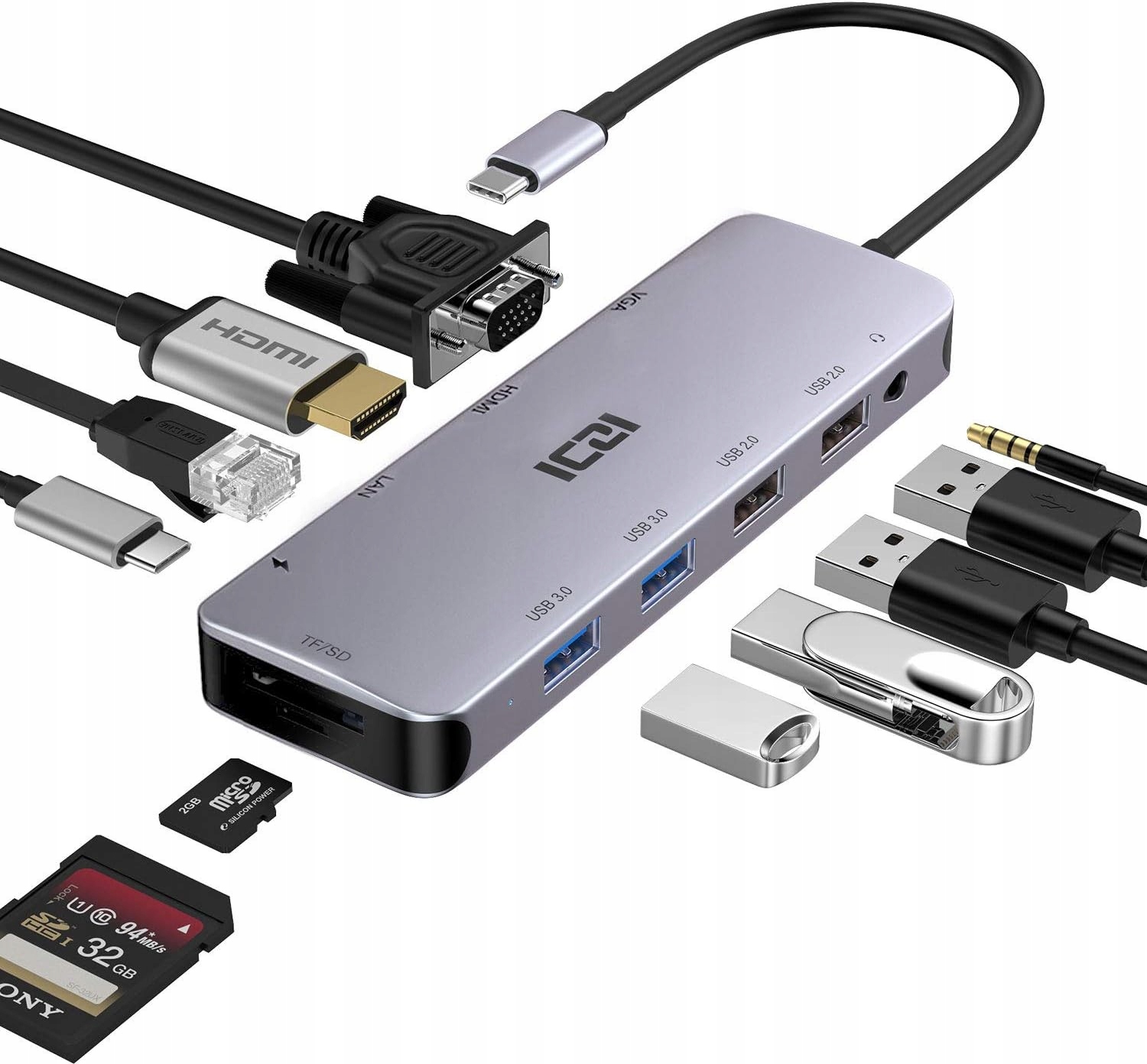 ICZI HUB USB-C 11 в док-станции 1-HDMI, USB 3.0, VGA, PD Зарядка