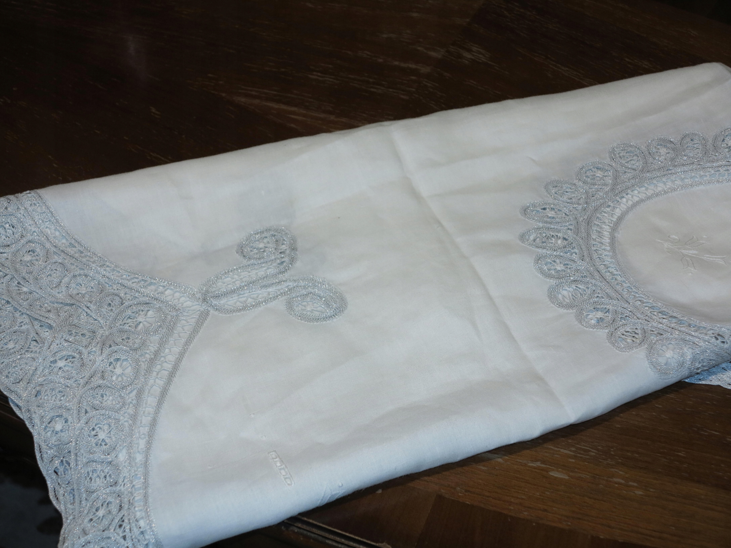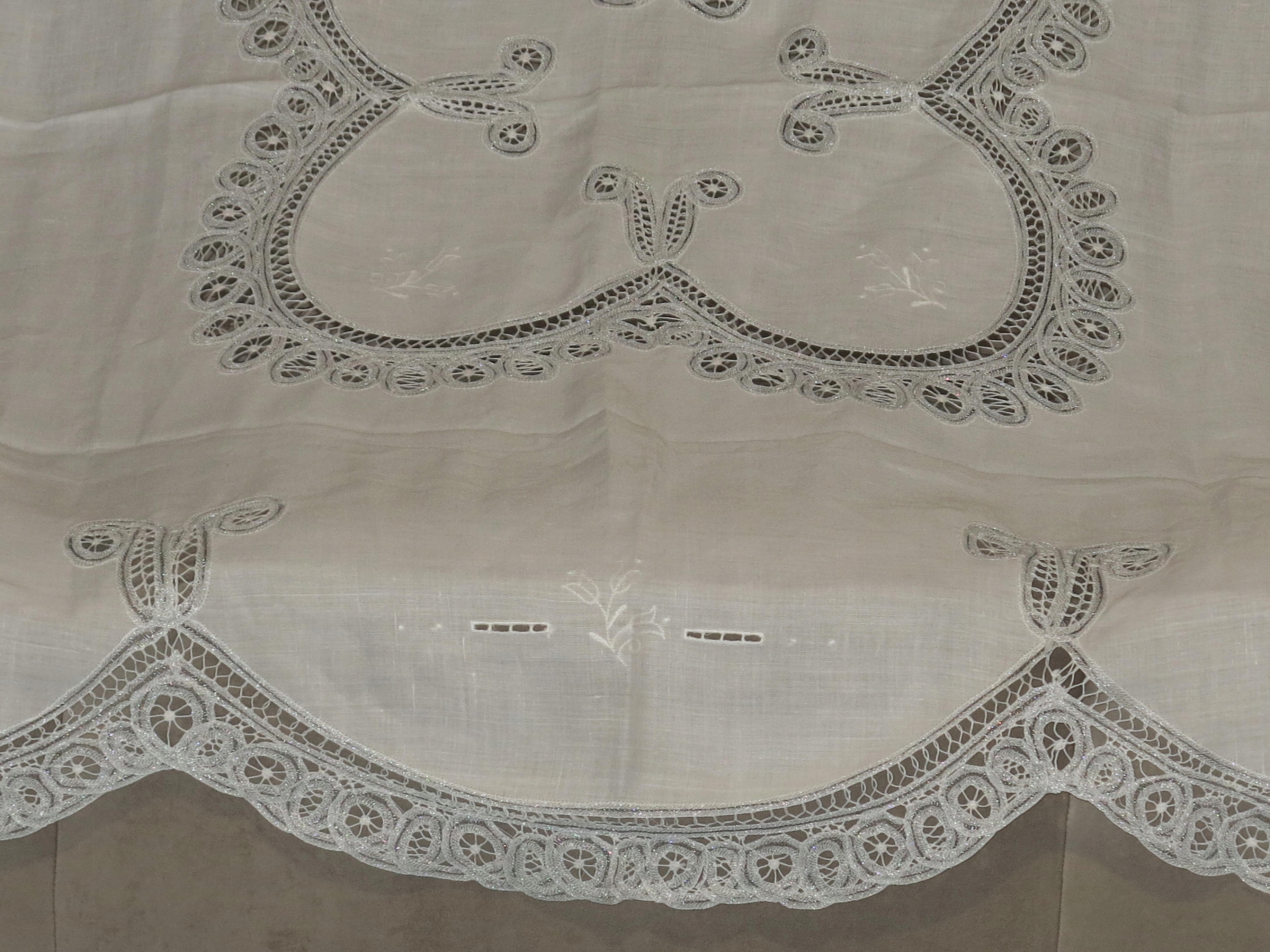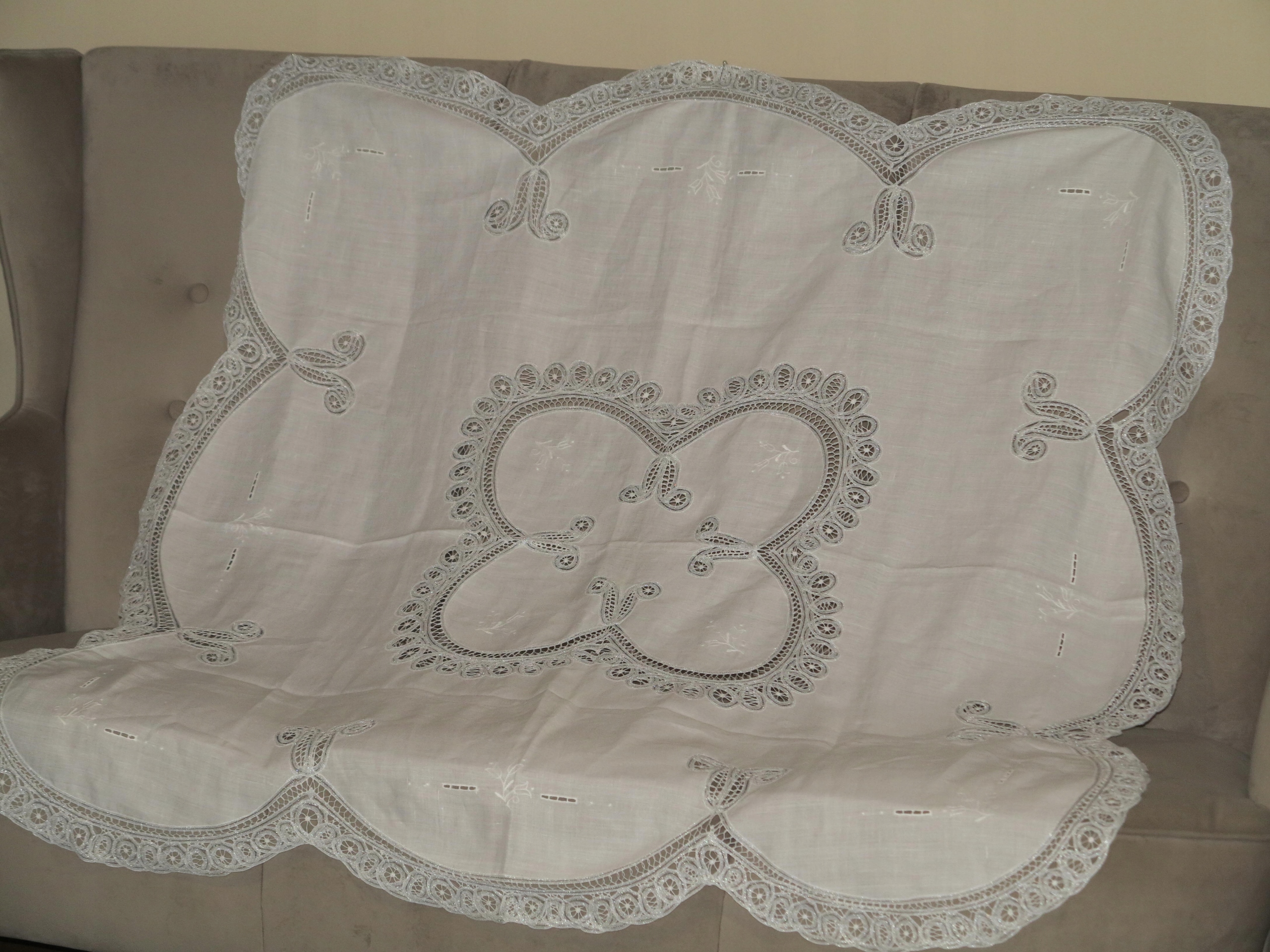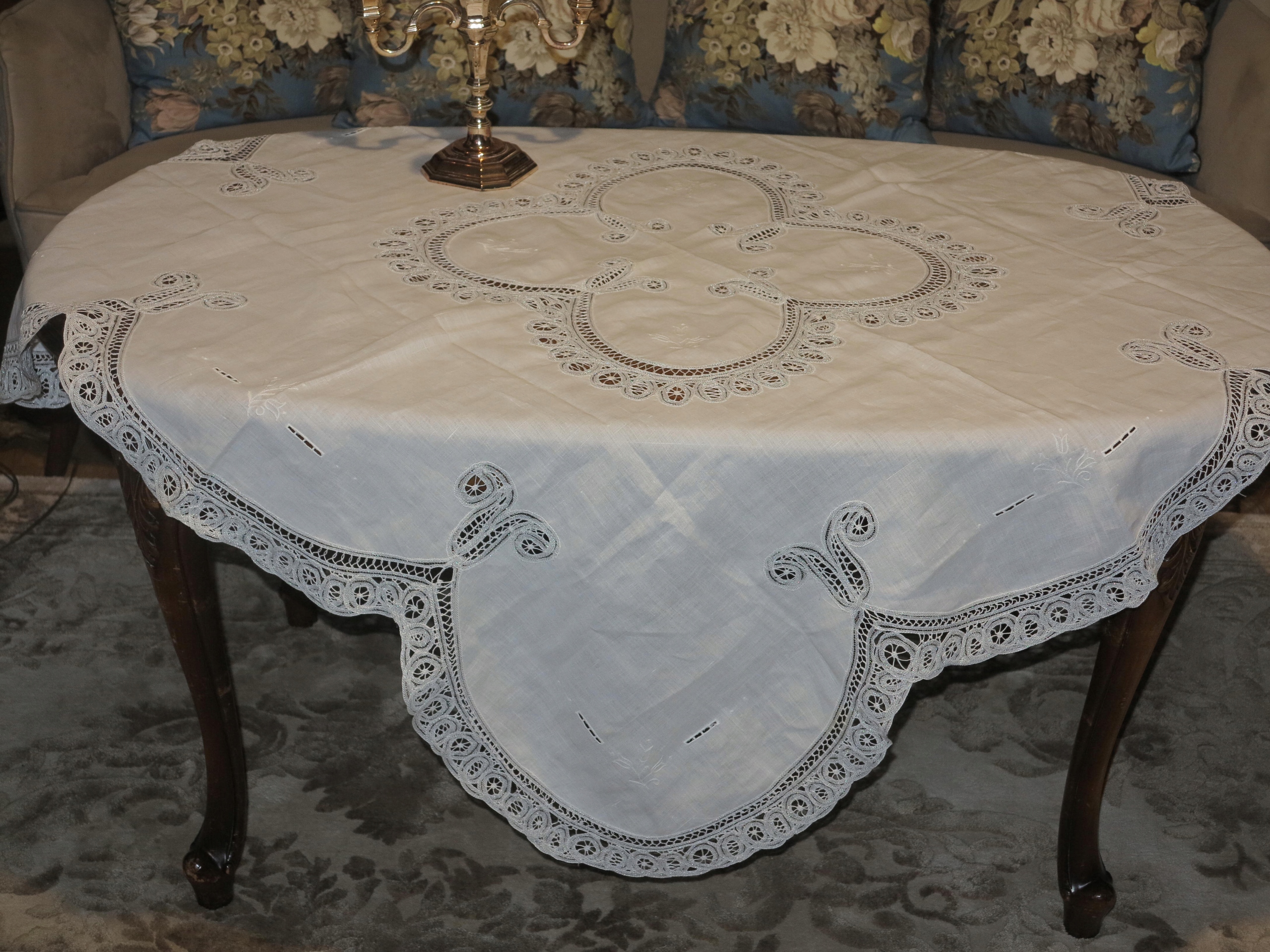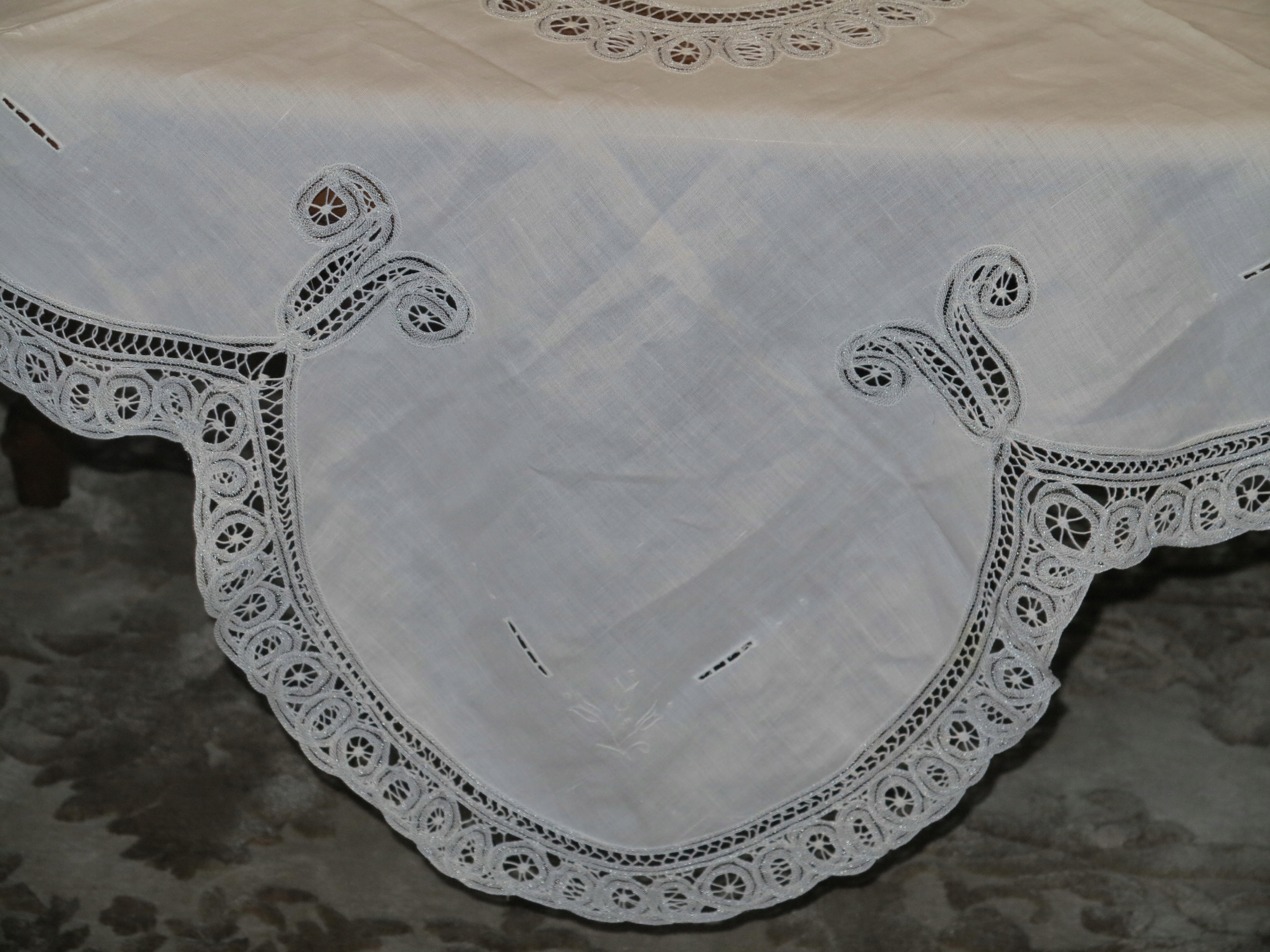 ИДЕАЛ - ЧУДЕСНАЯ СНЕЖНО-БЕЛАЯ ЛЬНЯНАЯ СКАТЕРТЬ С СЕРЕБРЯНЫМ БРЮССЕЛЬСКИМ КРУЖЕВОМ, ВЫШИВКА