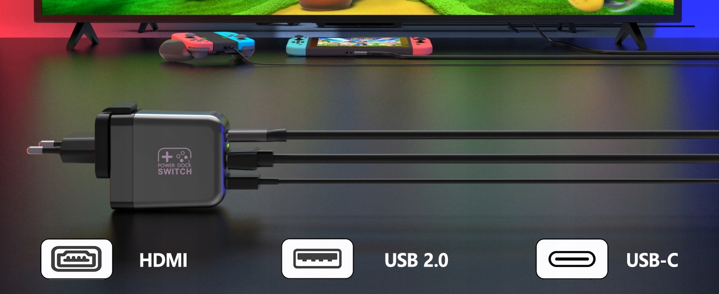 порт USB-C поддерживает быструю зарядку, поэтому вы можете полностью зарядить консоль коммутатора всего за 2,5 часа, а также может зарядить консоль переключателя в ручном режиме и поддерживать достаточное количество Сила (вход: 100-240 В ~ 50/60 Гц;)