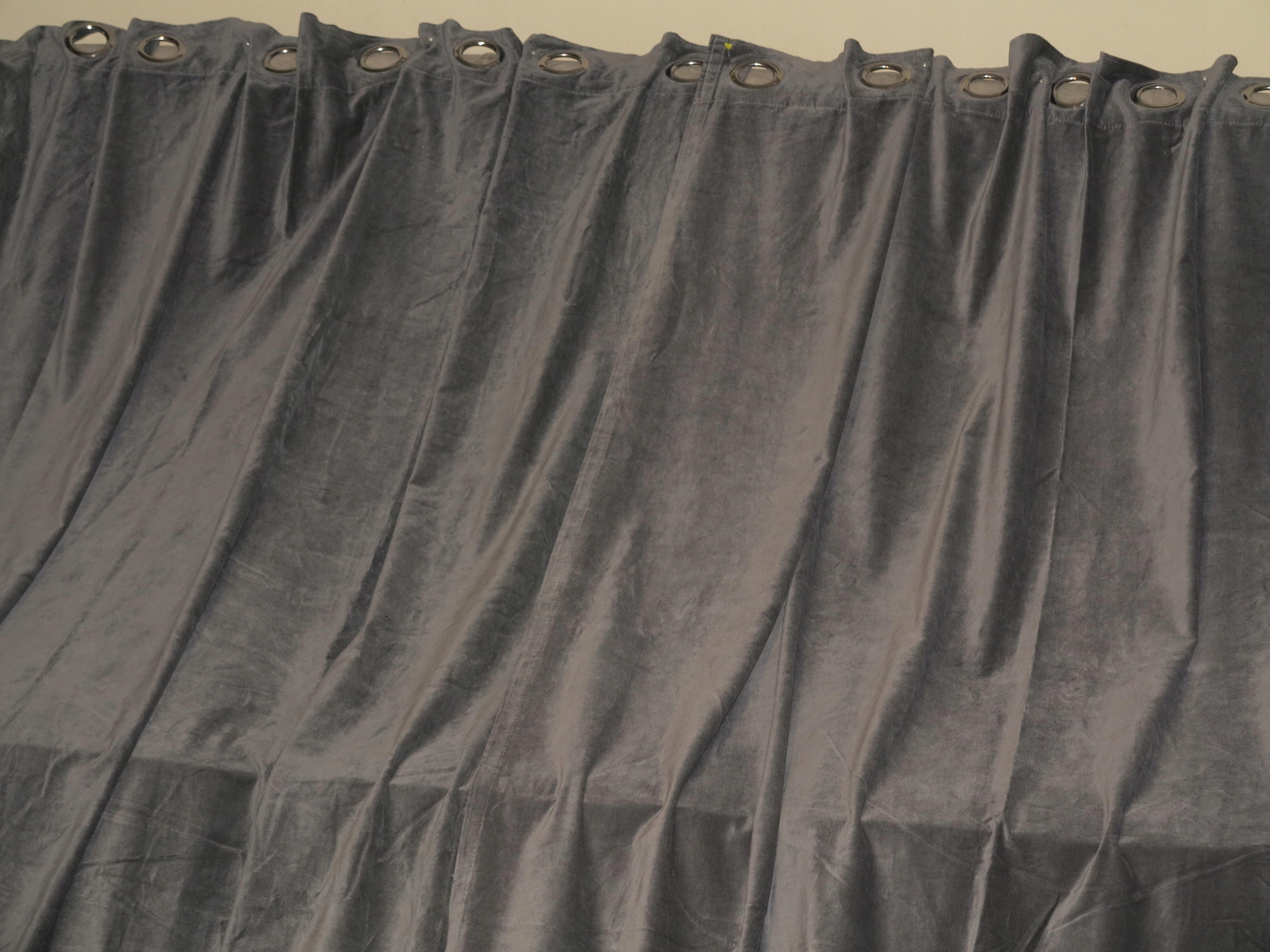sanela- набор красивых бархатных штор с застрявшими металлическими колесами. Шторы, изготовленные из темно -серого хлопкового бархатного бархатного бархата
