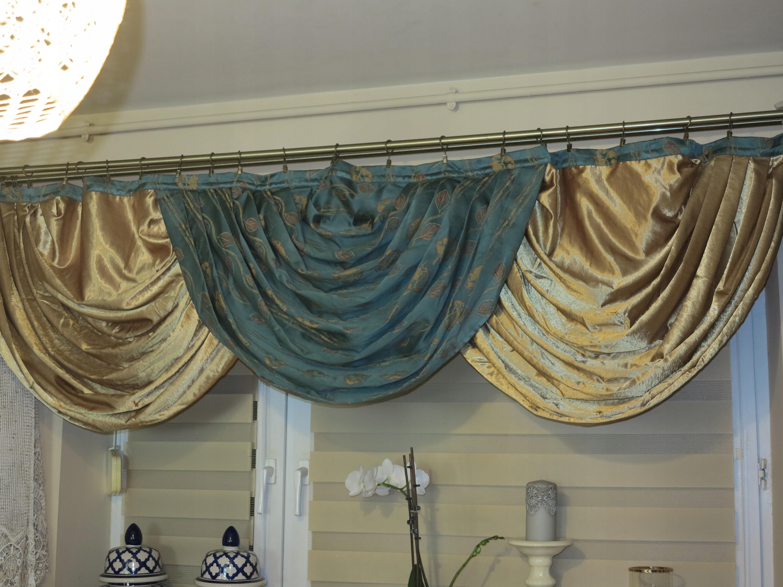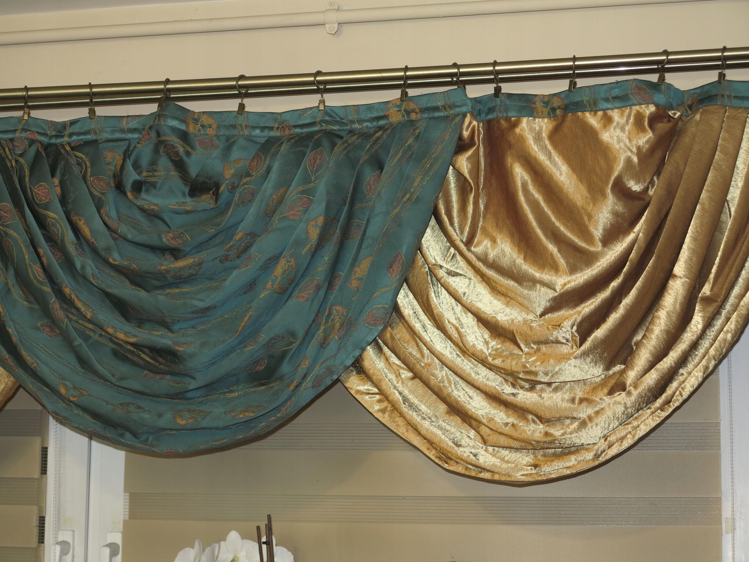 Элегантный ламбрекен, пошит цельным куском, состоящим из трех частей. ИДЕАЛЬНО СШИТ ЛАМБРЕКЕН, КРАСИВО РАБОТАЕТ НА ВОДЕ, ИЗГОТОВЛЕН ИЗ ПЛОТНОЙ, ПРОЧНОЙ АТЛАСНОЙ ТКАНИ (ЗОЛОТО) И ЖАККАРДОВОЙ ТКАНИ (ЗЕЛЕНАЯ С ЗОЛОТЫМИ УЗОРАМИ)