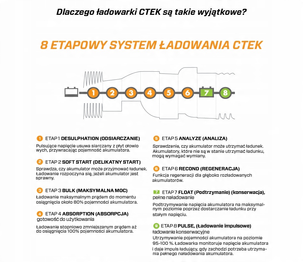 - Уникальный 8-этапный процесс зарядки — запатентованная 8-этапная программа зарядки включает проверку работоспособности аккумулятора, восстановление, зарядку и техническое обслуживание, чтобы обеспечить максимальный срок службы аккумулятора и его производительность. Благодаря функции RECOND можно регенерировать глубоко разряженные аккумуляторы с помощью расслаивающегося электролита. Функция поддерживающей зарядки PULSE обеспечивает отличную службу аккумулятора в периоды, когда он не используется.